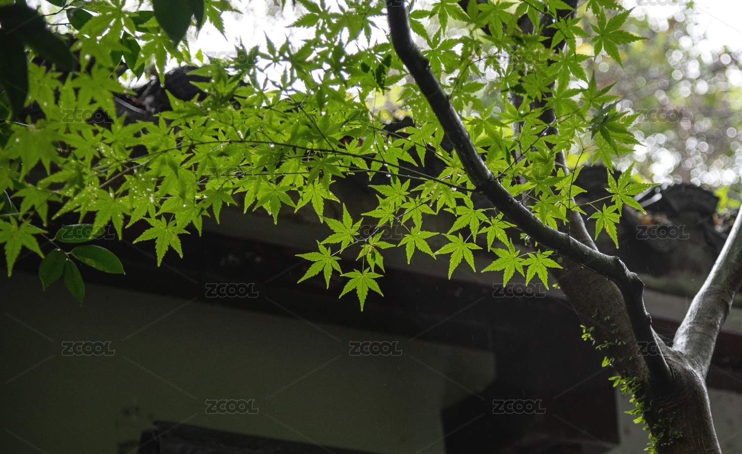 浙江杭州西湖旁房屋的鸡爪槭树叶特写
