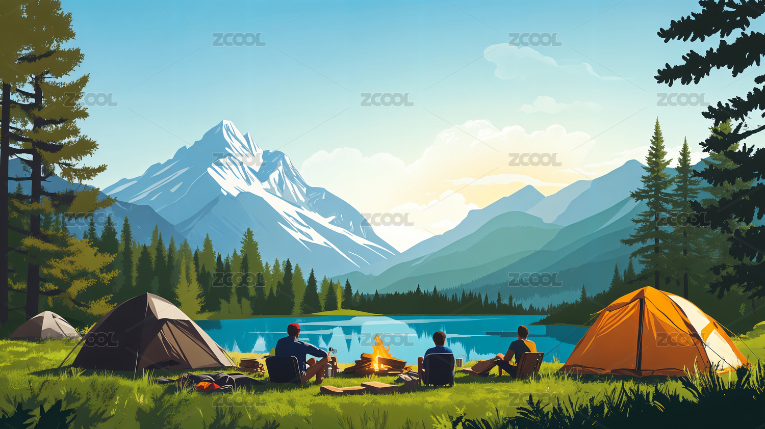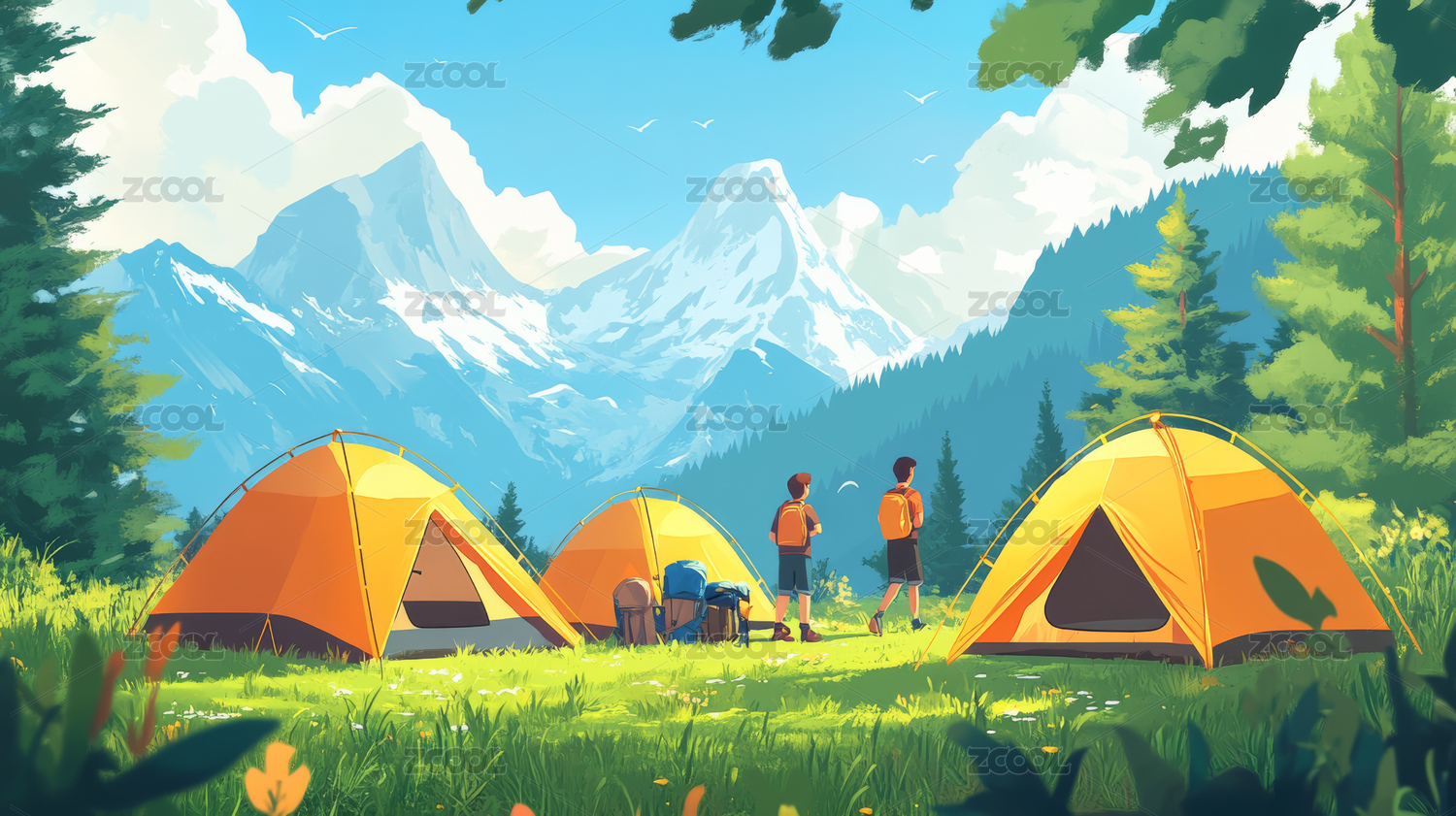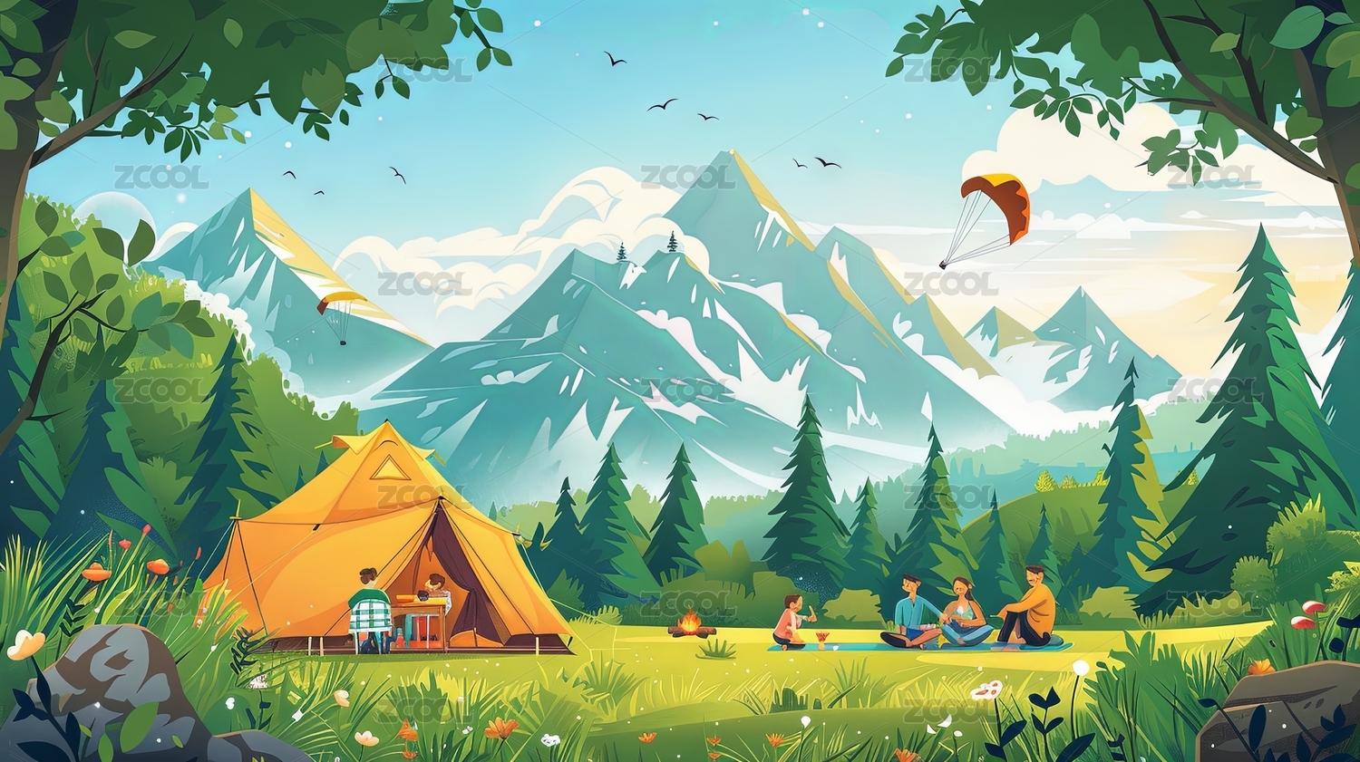 户外,露营,聚餐,家人,朋友,插画,背景,场景,帐篷,风筝
