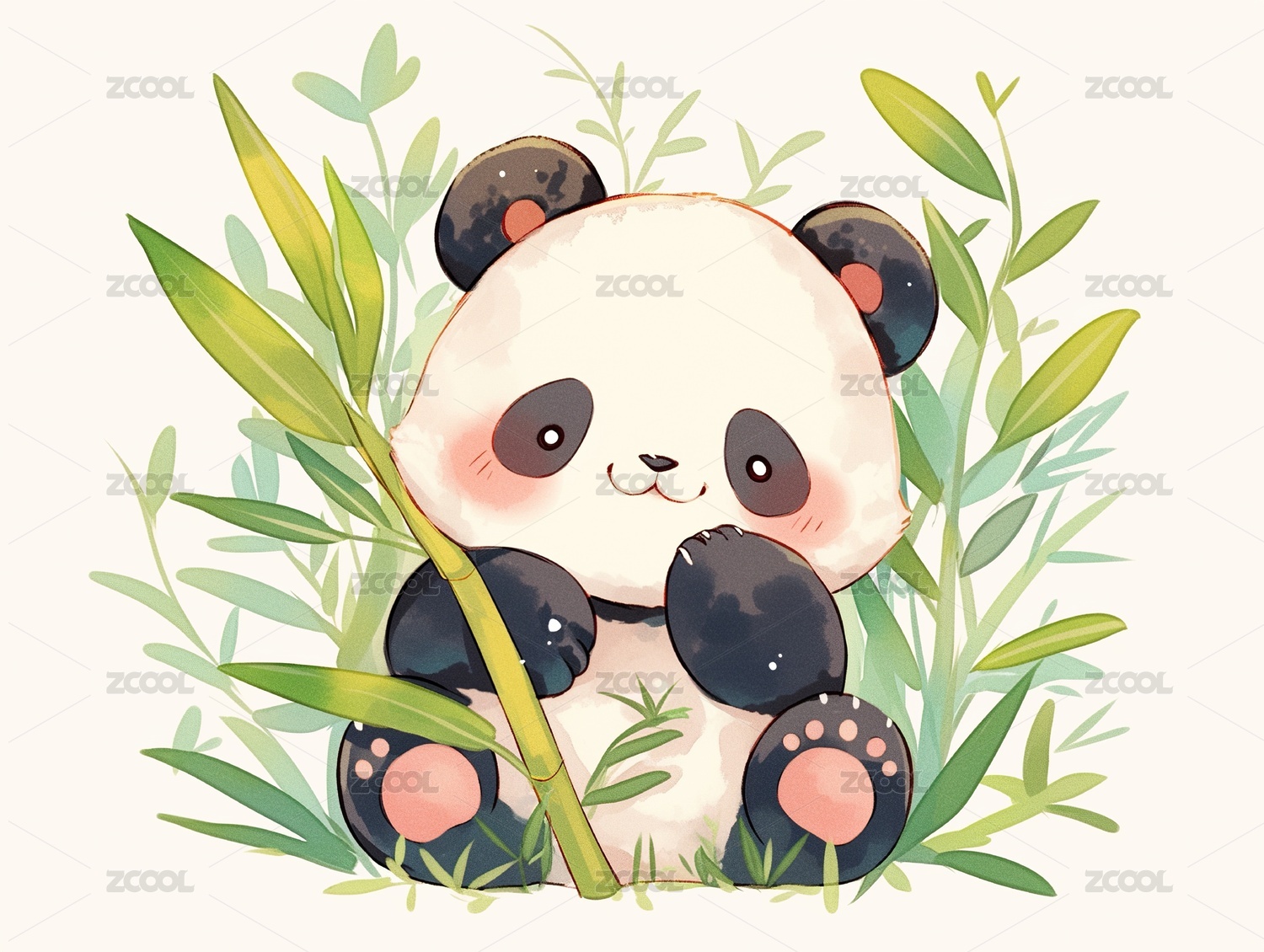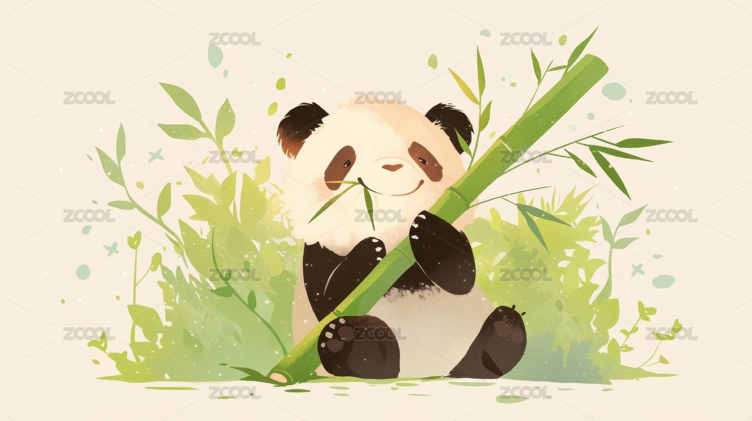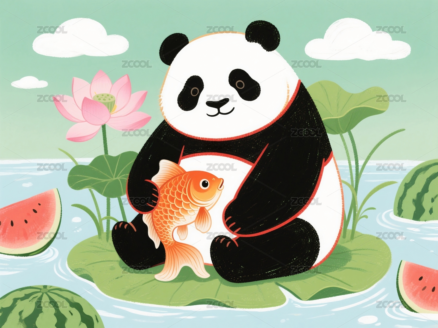 划船,熊猫,荷花,夏天,国宝,卡通,插画,植物,大暑,小暑