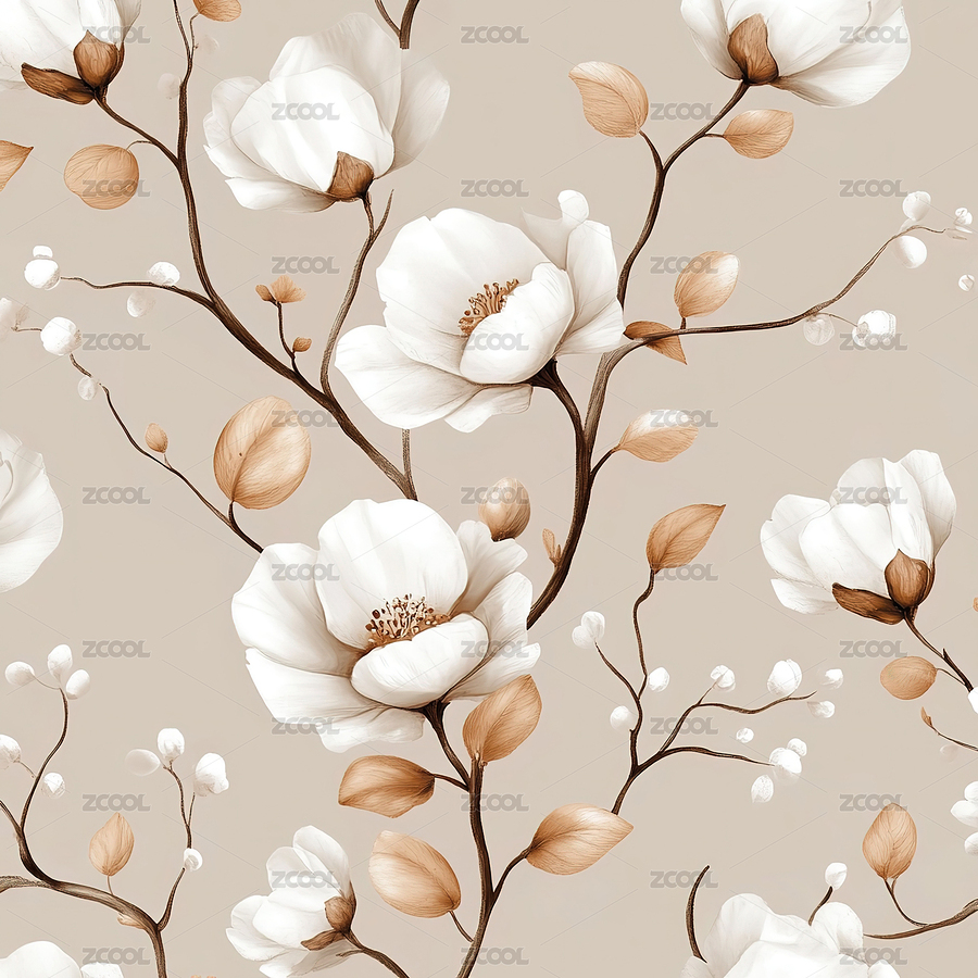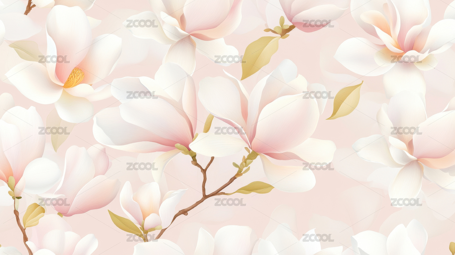 清新典雅带枝条的玉兰四方连续无缝拼接背景