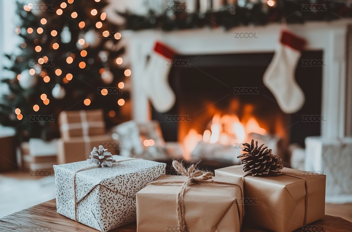 圣诞树下礼物与壁炉