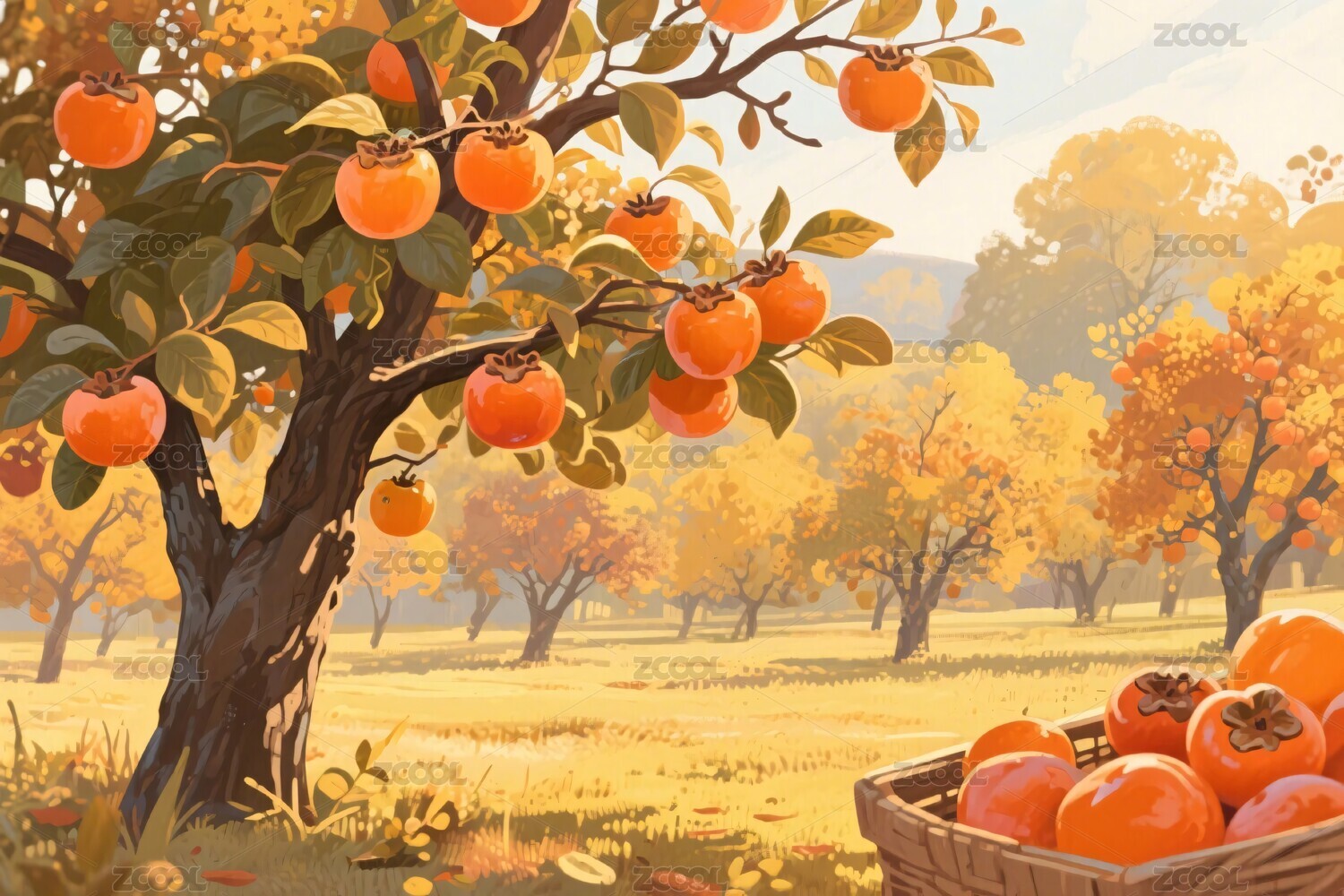 AIGC202402,秋季,晴天,金黄色,原野,果实,果树,手绘,秋天,晴朗