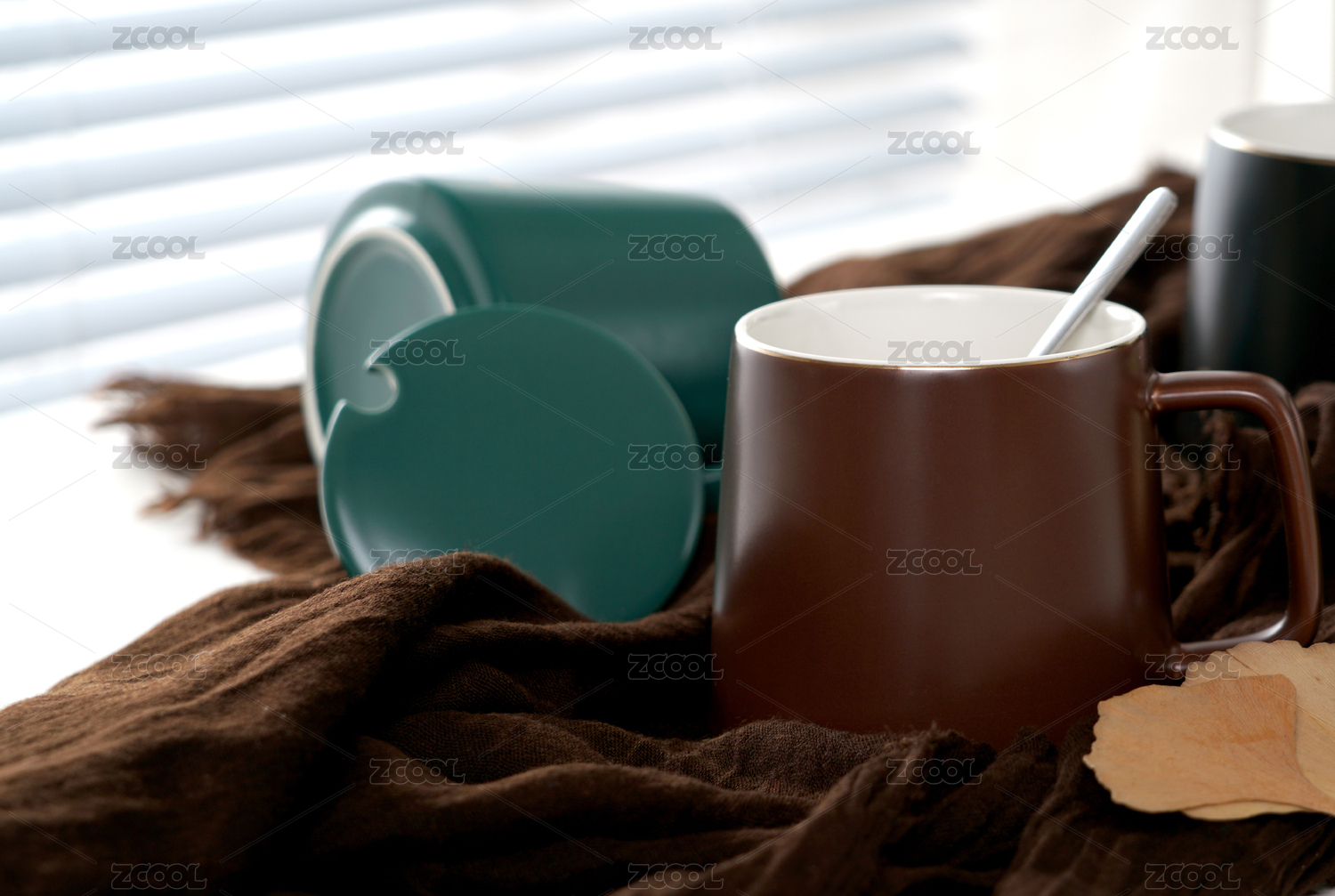白色陶瓷杯静置温暖织物上