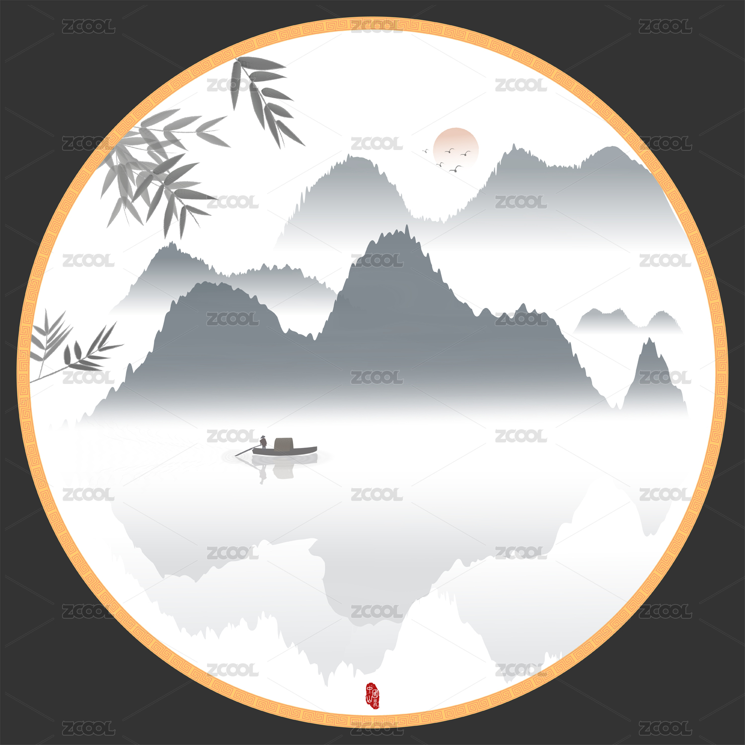 圆形水墨竹子意境山水装饰矢量装饰背景图