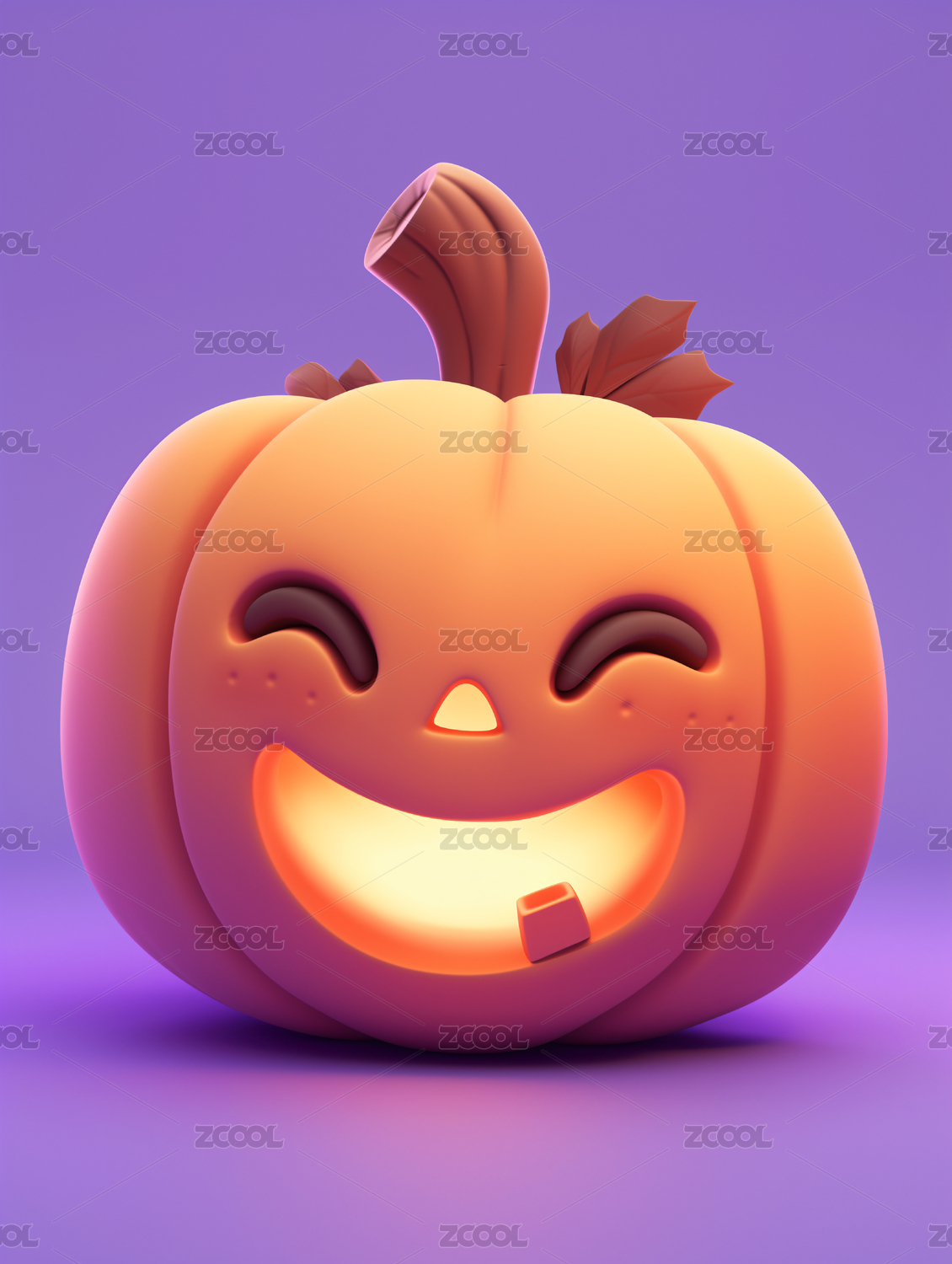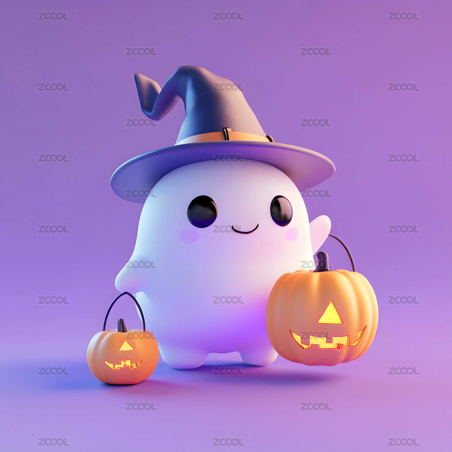 戴着女巫帽的幽灵提着南瓜紫色背景