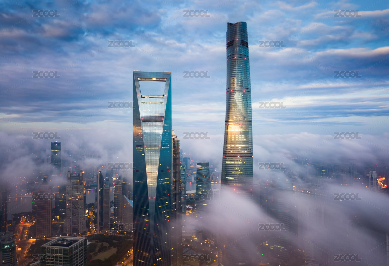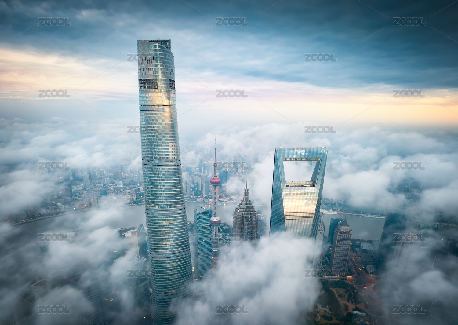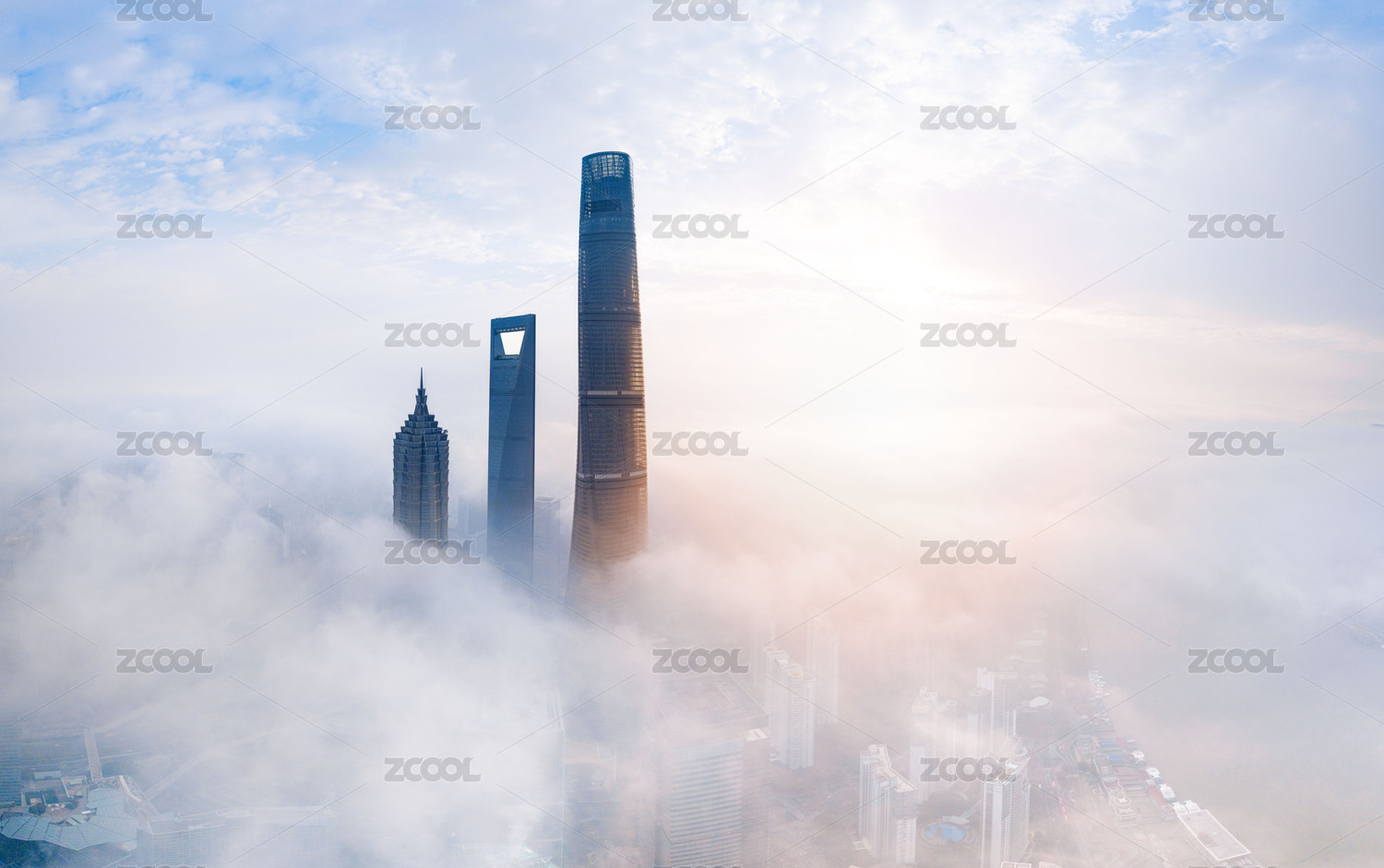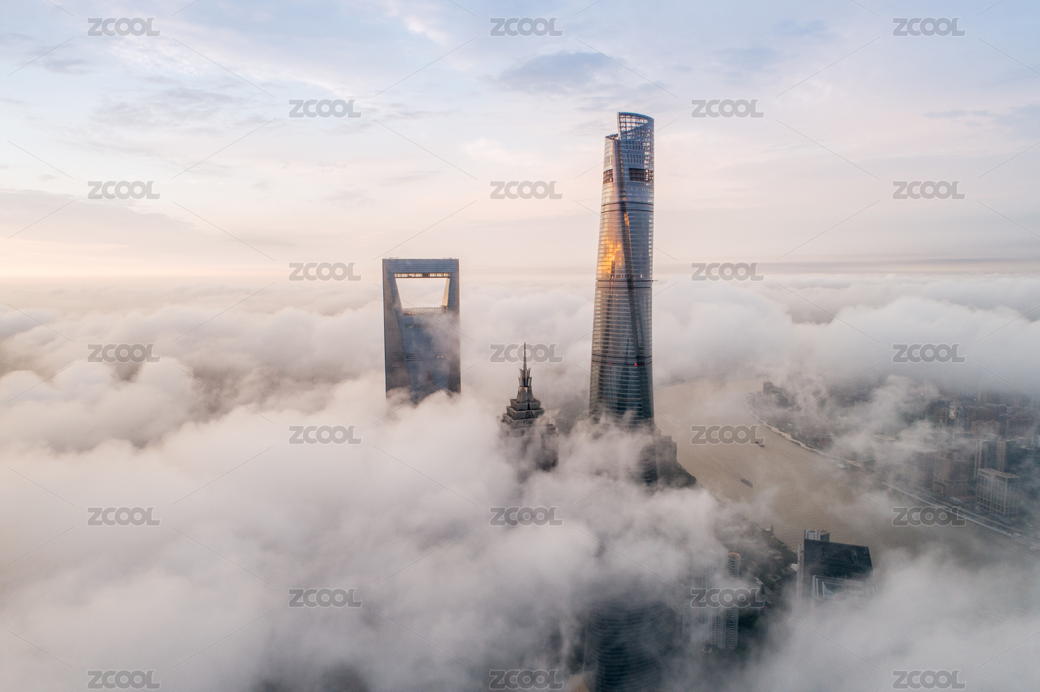 航拍上海外滩陆家嘴城市平流雾建筑风光