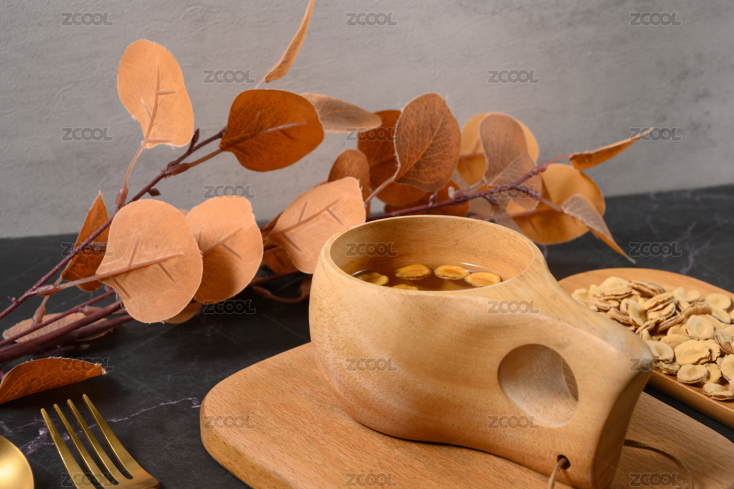 桌面上的杯子里的甘甜可口的天麻茶