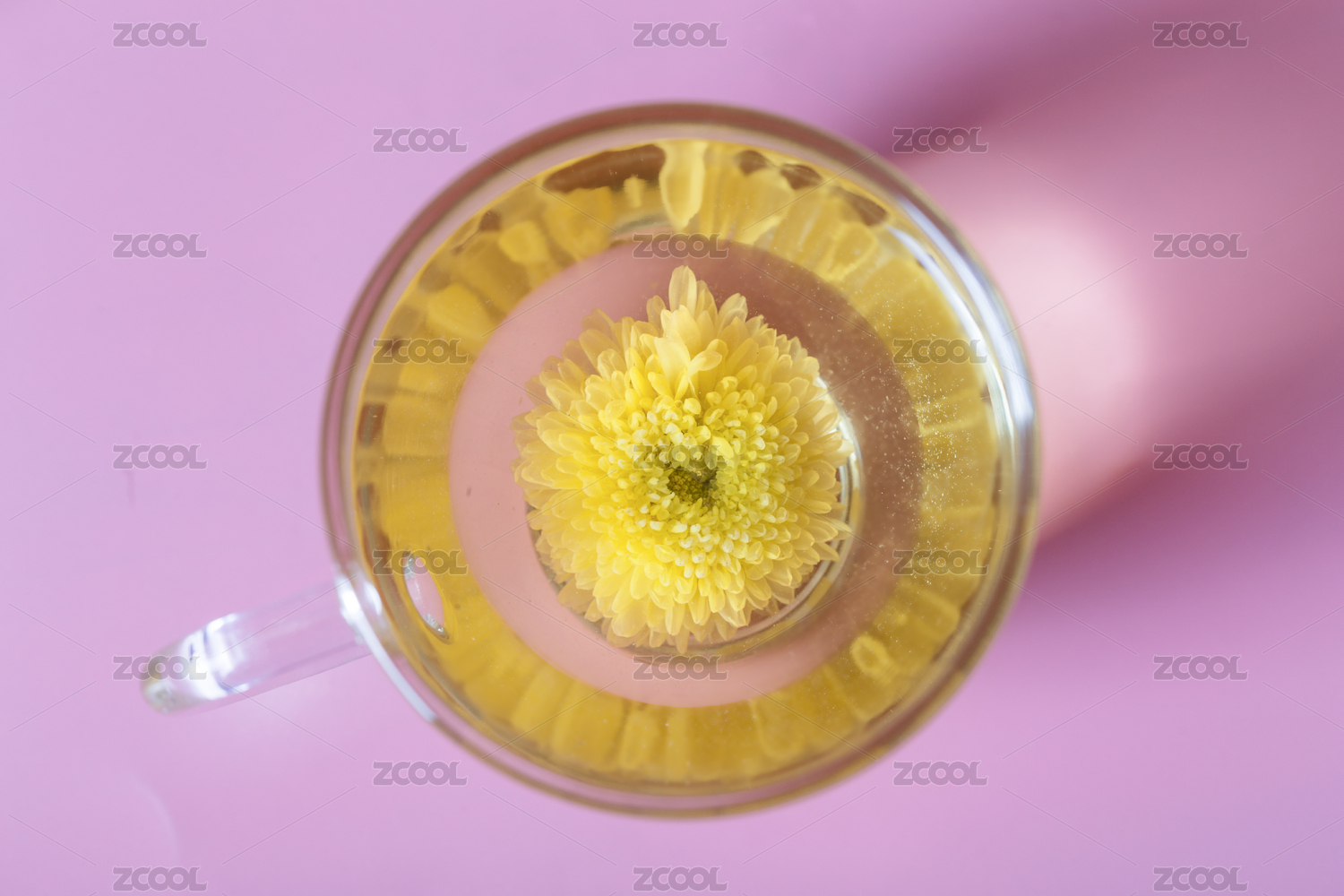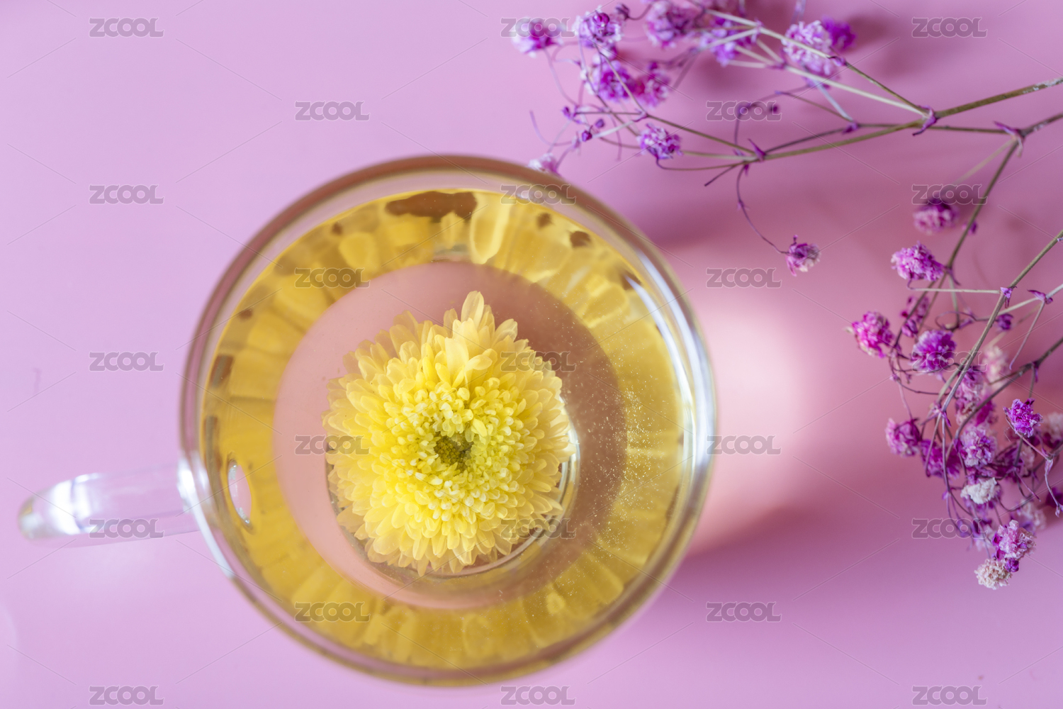 俯拍粉红色浪漫风格的小黄菊健康花茶与茶杯特写
