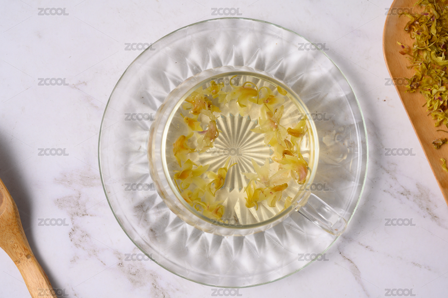 桌面上的杯子里的甘甜可口的石斛花茶