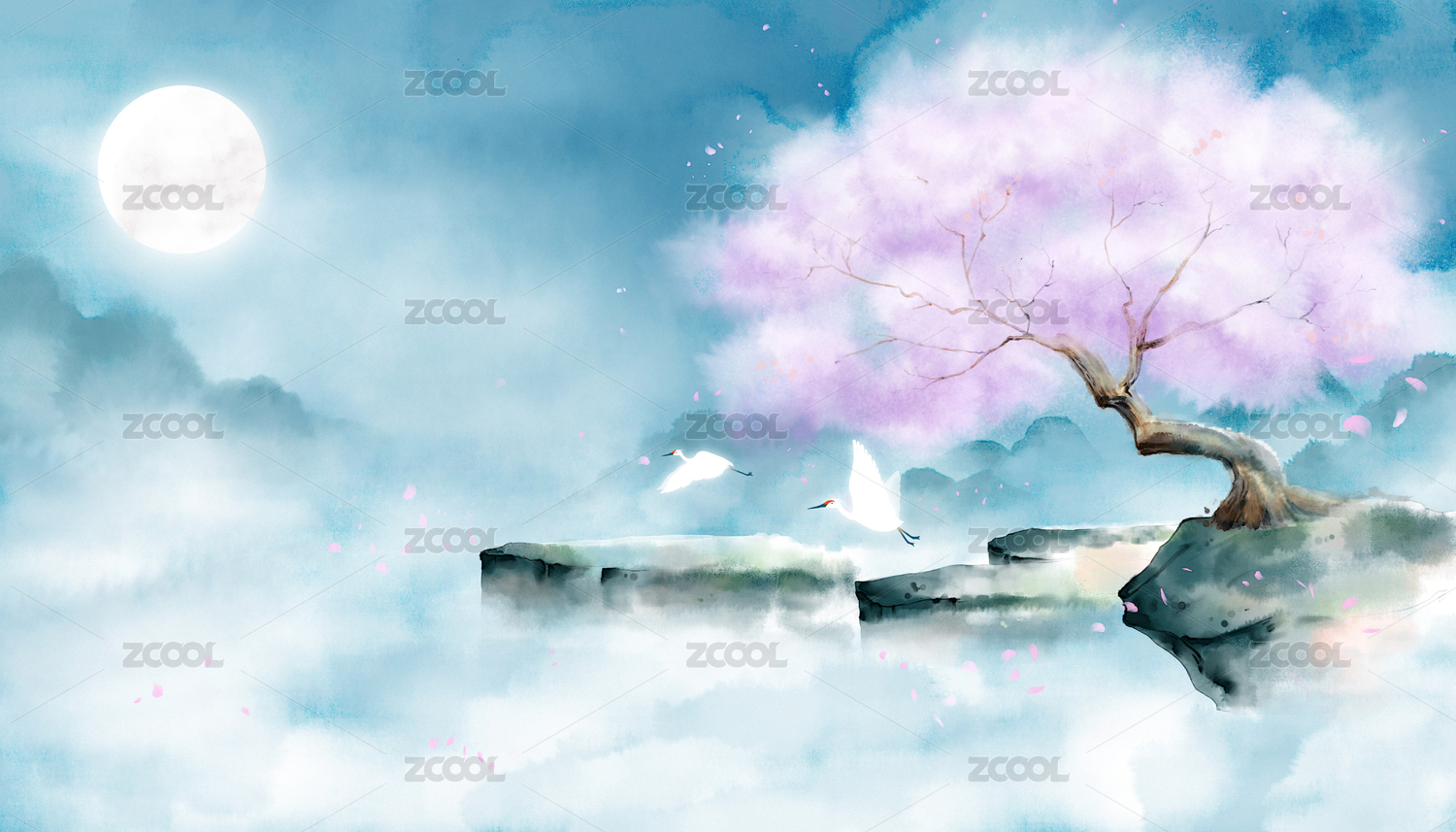 夜晚月光紫色花瓣的树下有两只仙鹤插画场景