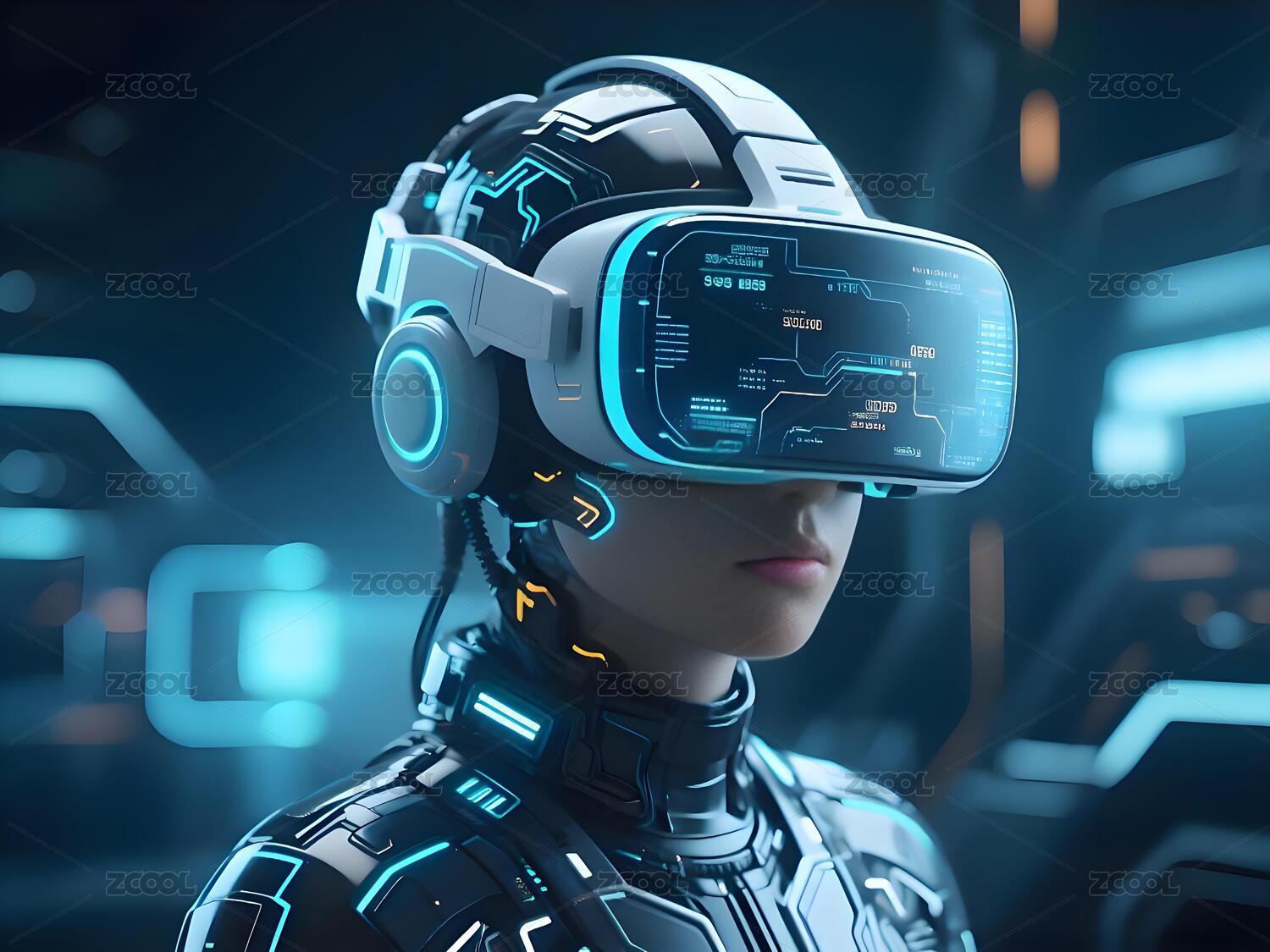 未来机器人戴着VR眼镜科技背景