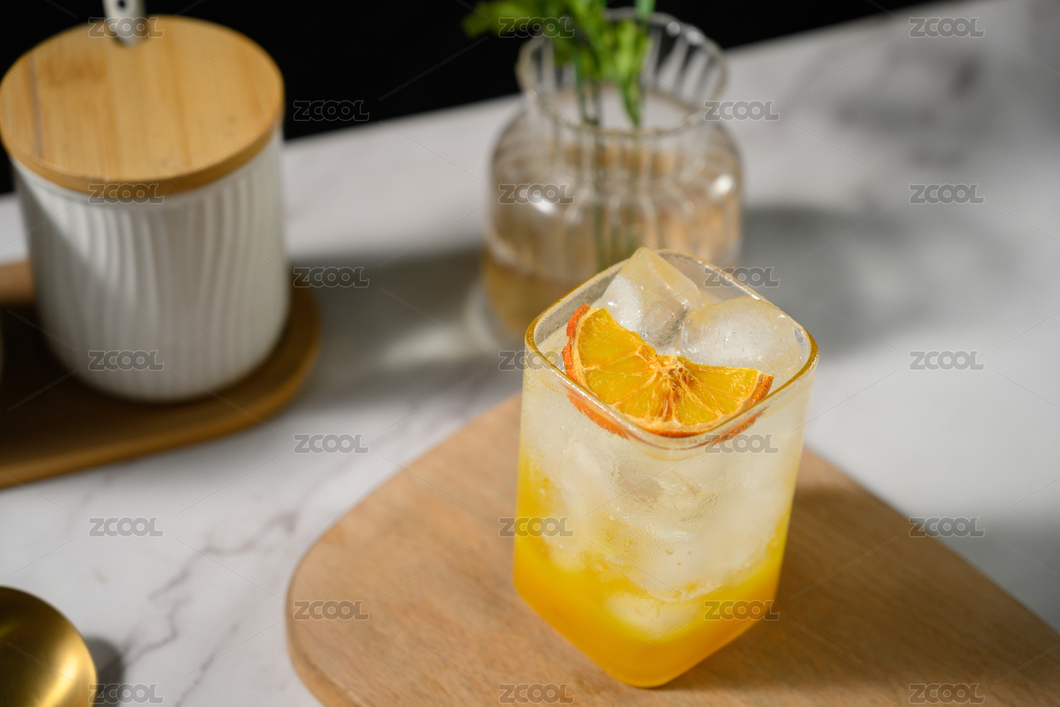 桌面上的杯子里的甘甜可口的冰木橘茶