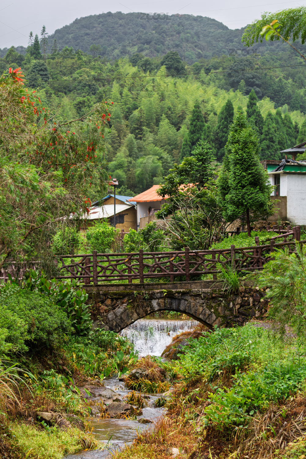 福建华安贡鸭山小溪上的石桥与乡村景色