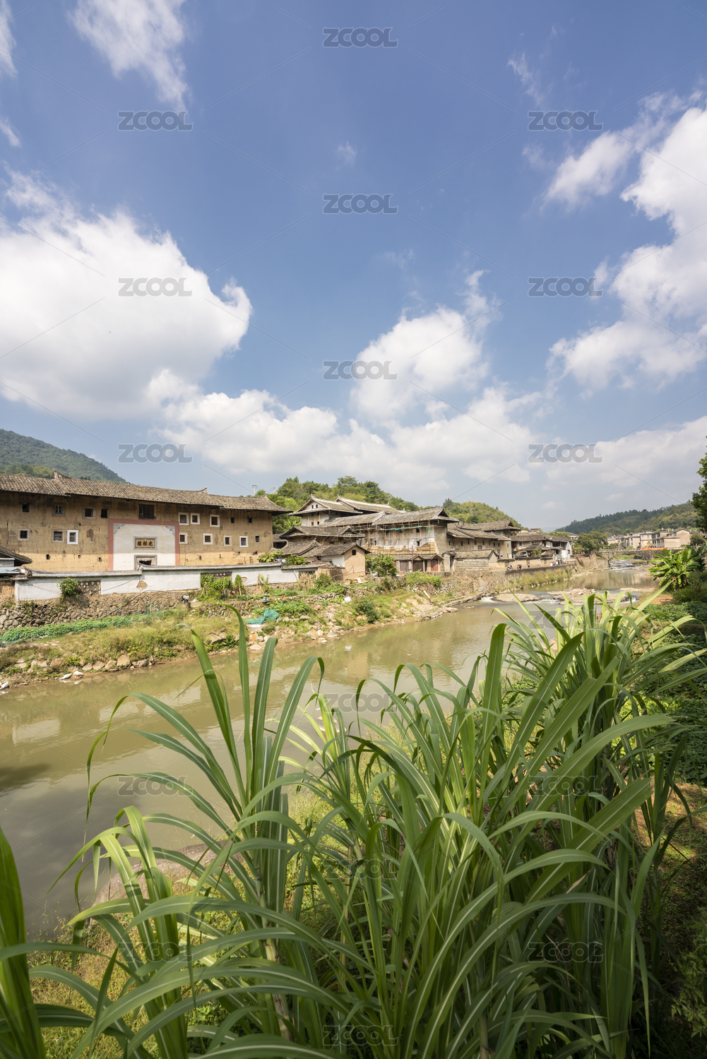 蓝天白云下河岸的几棵甘蔗及对岸的方形土楼,中国福建永定