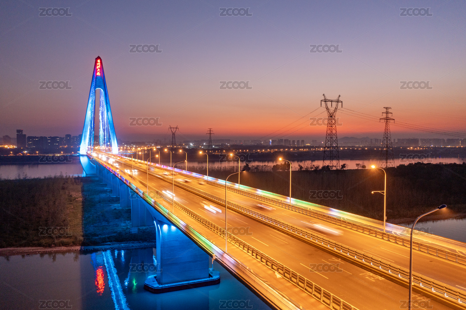 中国湖北荆州长江大桥日暮风光