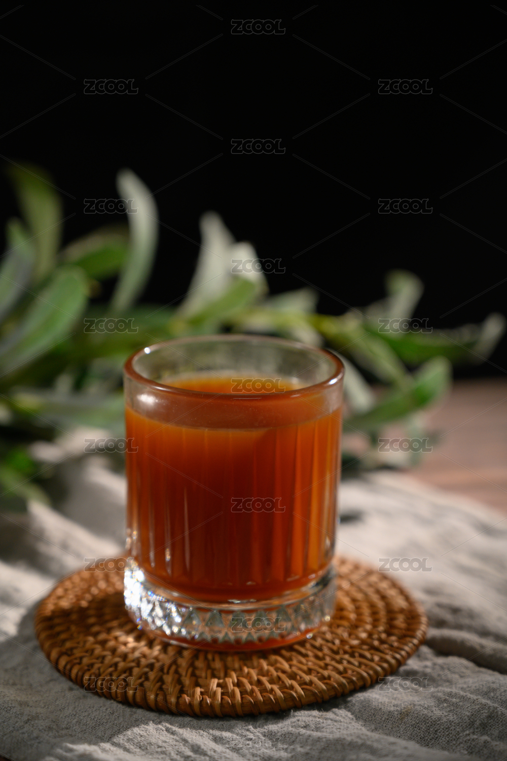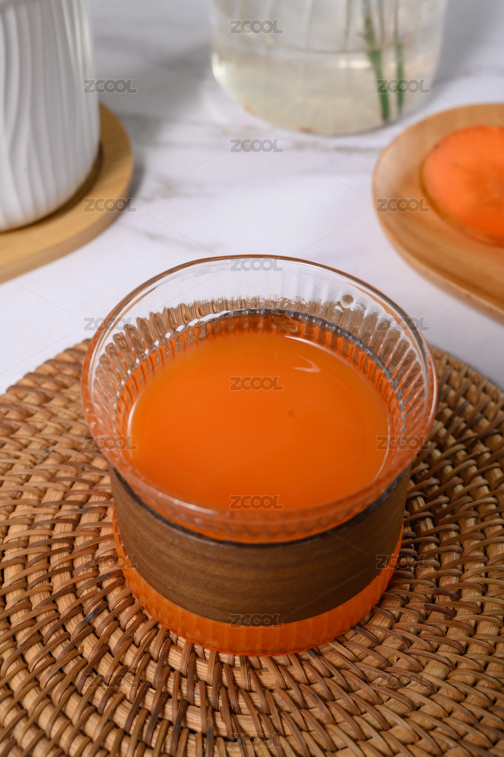 桌面上的杯子里美味可口的胡萝卜汁
