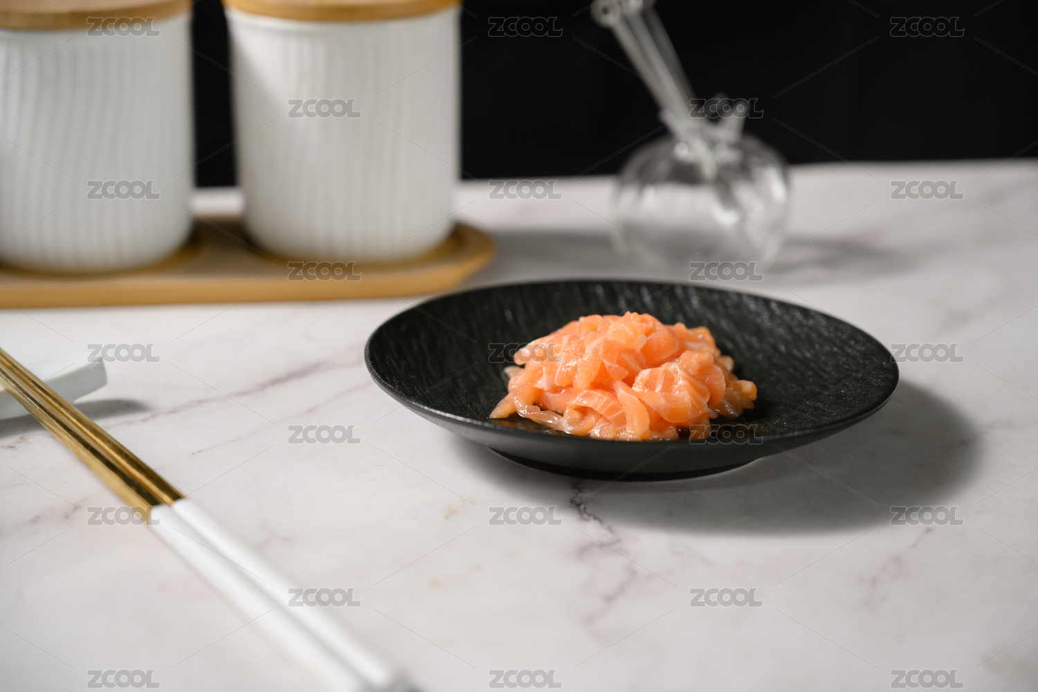 桌面上的盘子里的美味可口的三文鱼碎