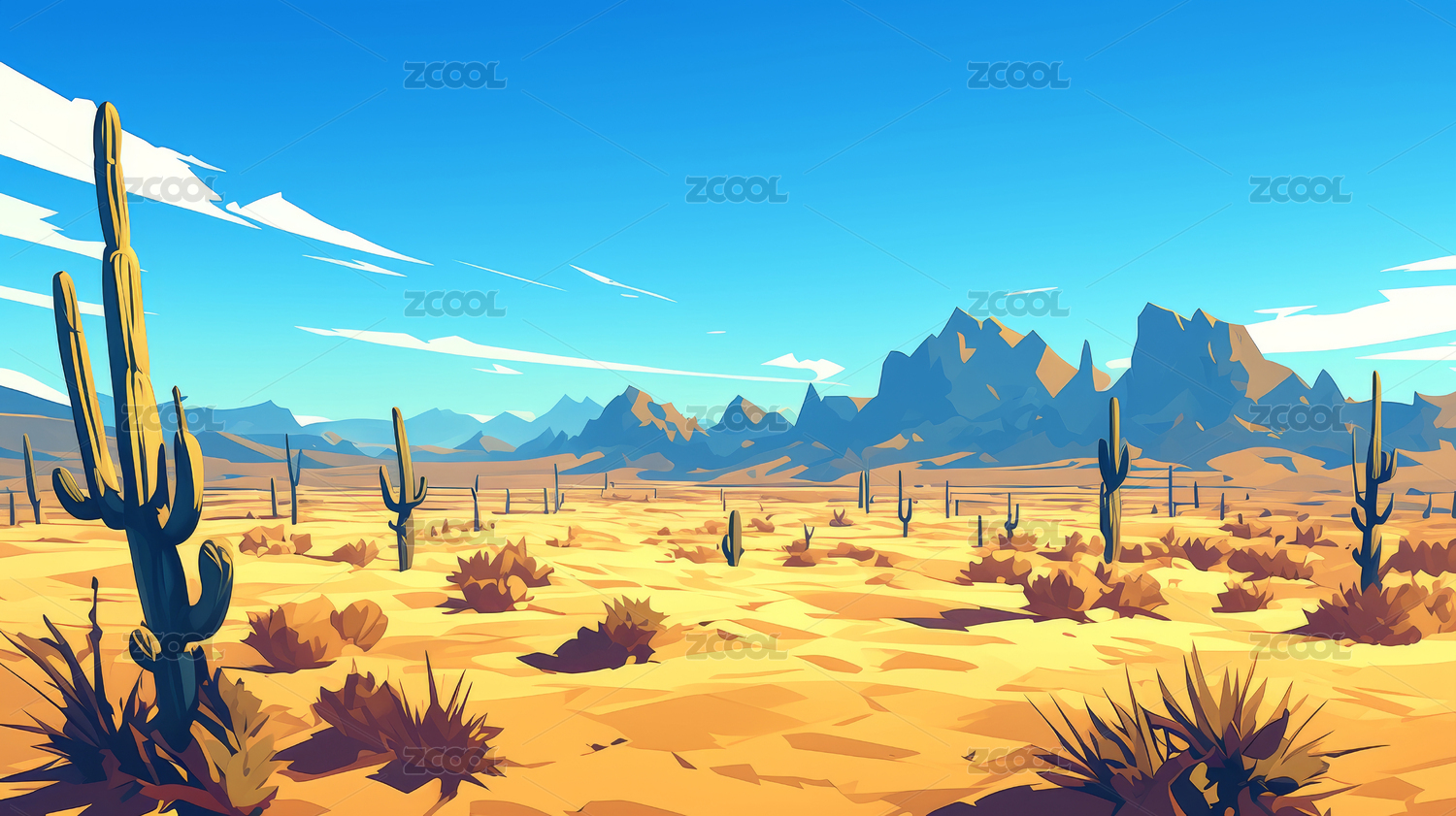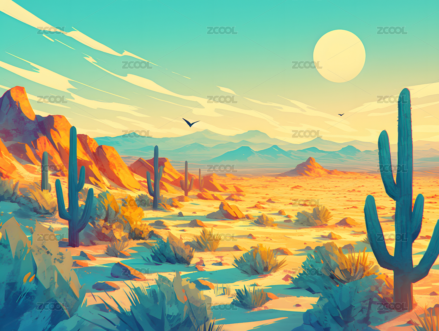 插画,旅行,旅游,AIGC202404,白云,山谷,沙漠,仙人掌,多肉,飞鸟