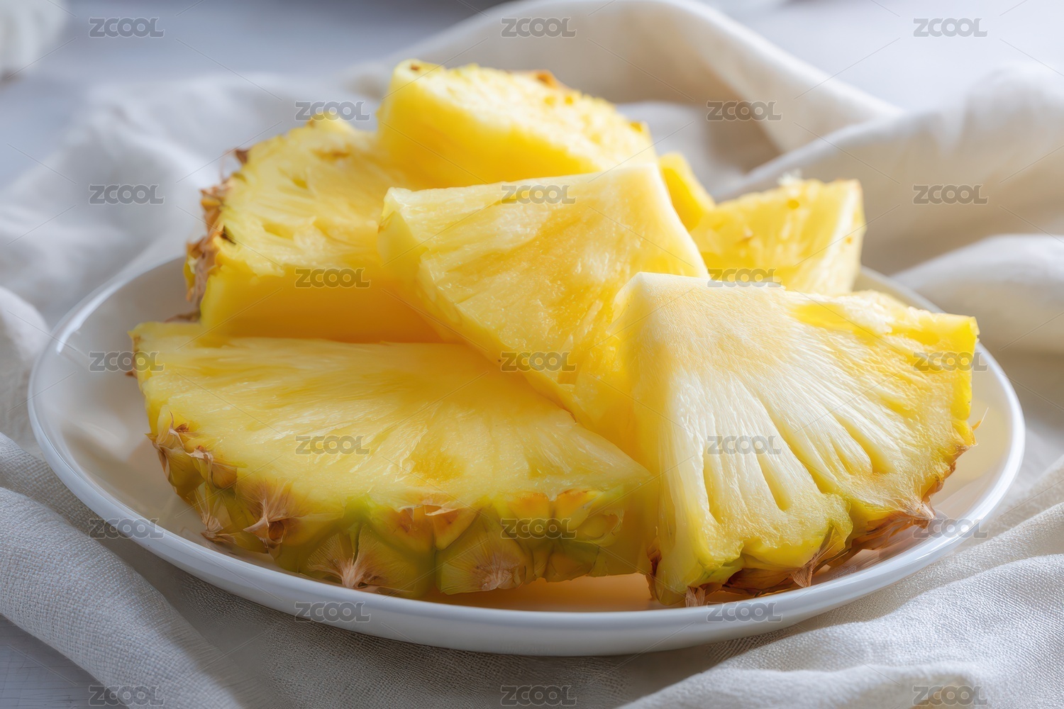 白色碟子上切开的热带水果金钻凤梨(无眼菠萝)