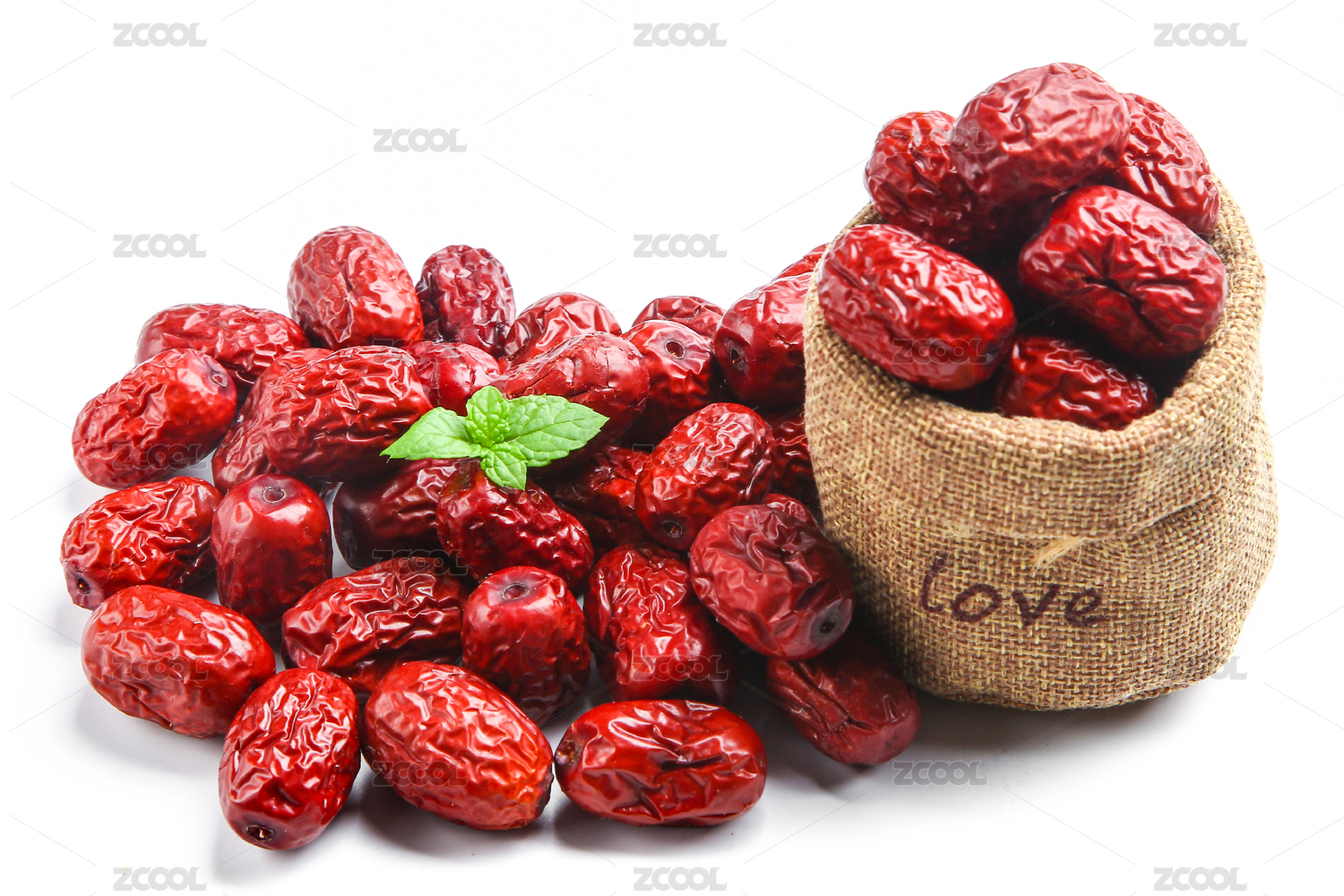 白底上放着红枣和一袋干红枣