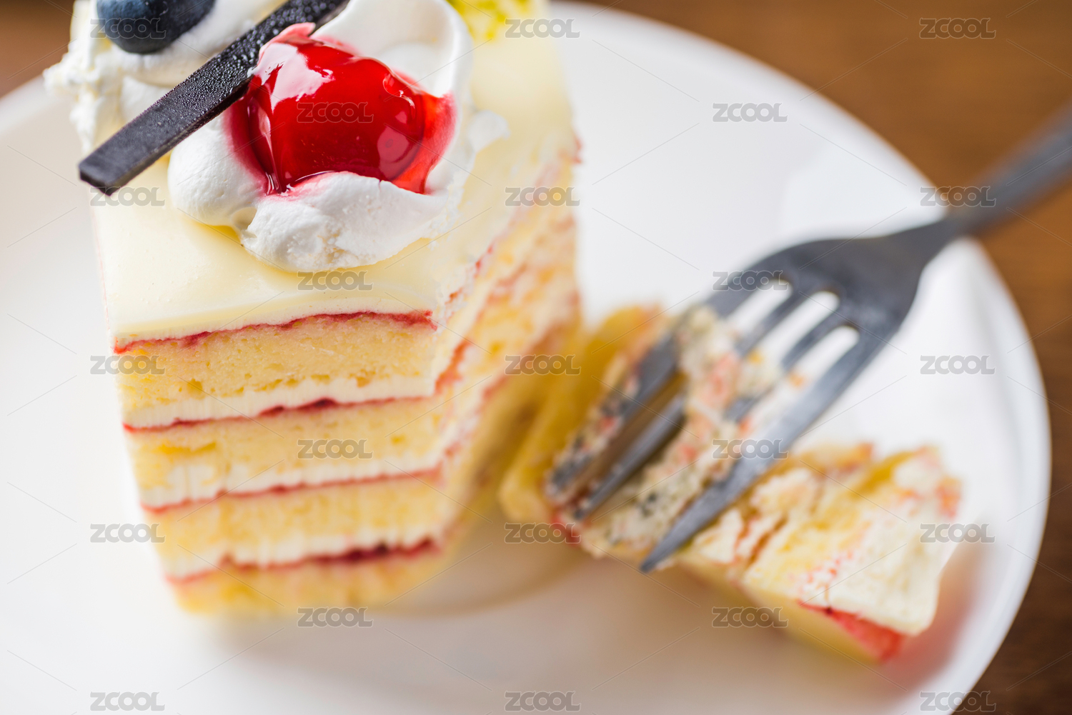 一块点缀有蓝莓和果酱的小蛋糕被叉子切开