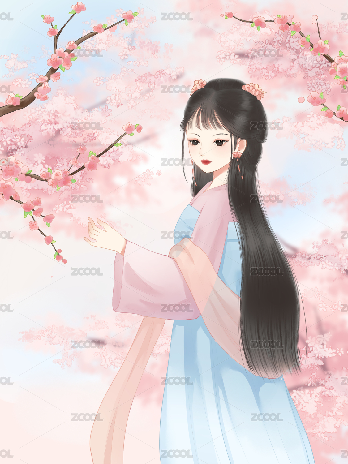 古风手绘人物汉服女孩站在桃花树下