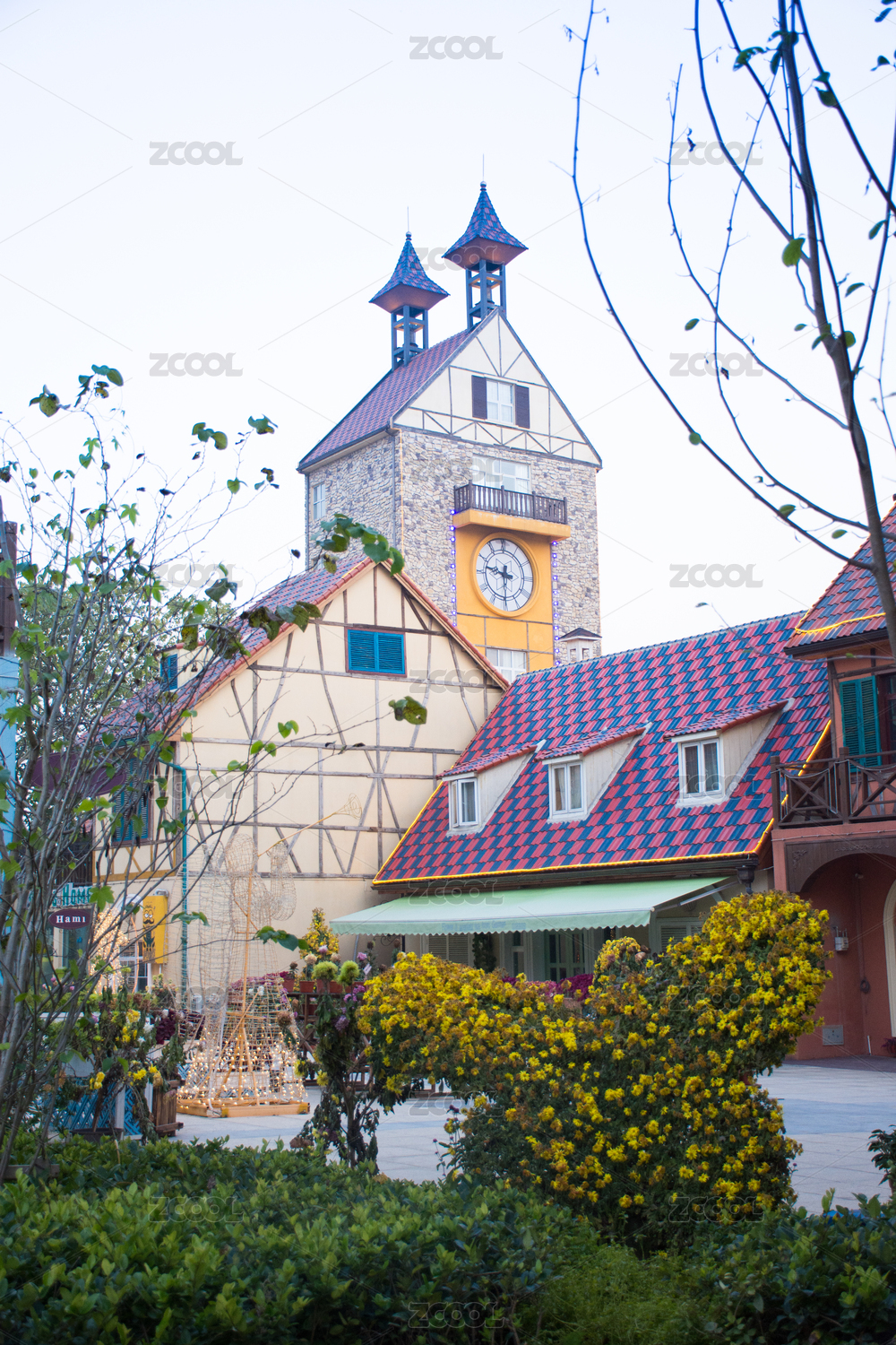 上海佛罗伦萨小镇仿欧式建筑钟楼特写