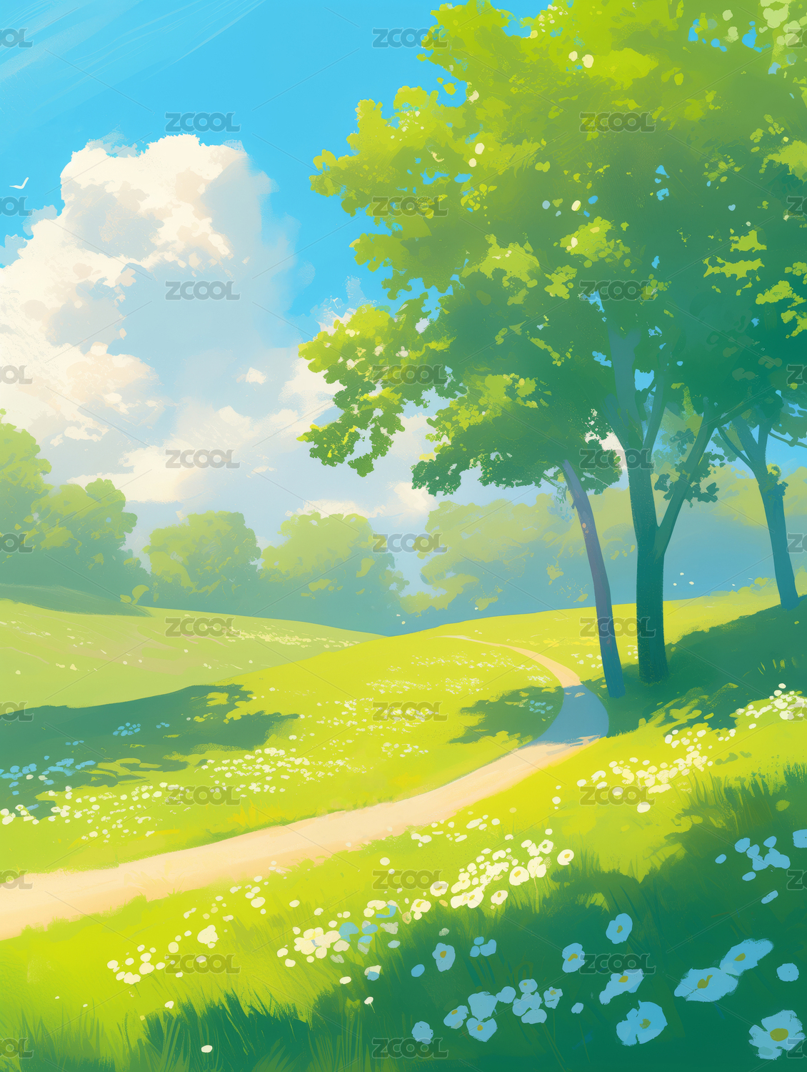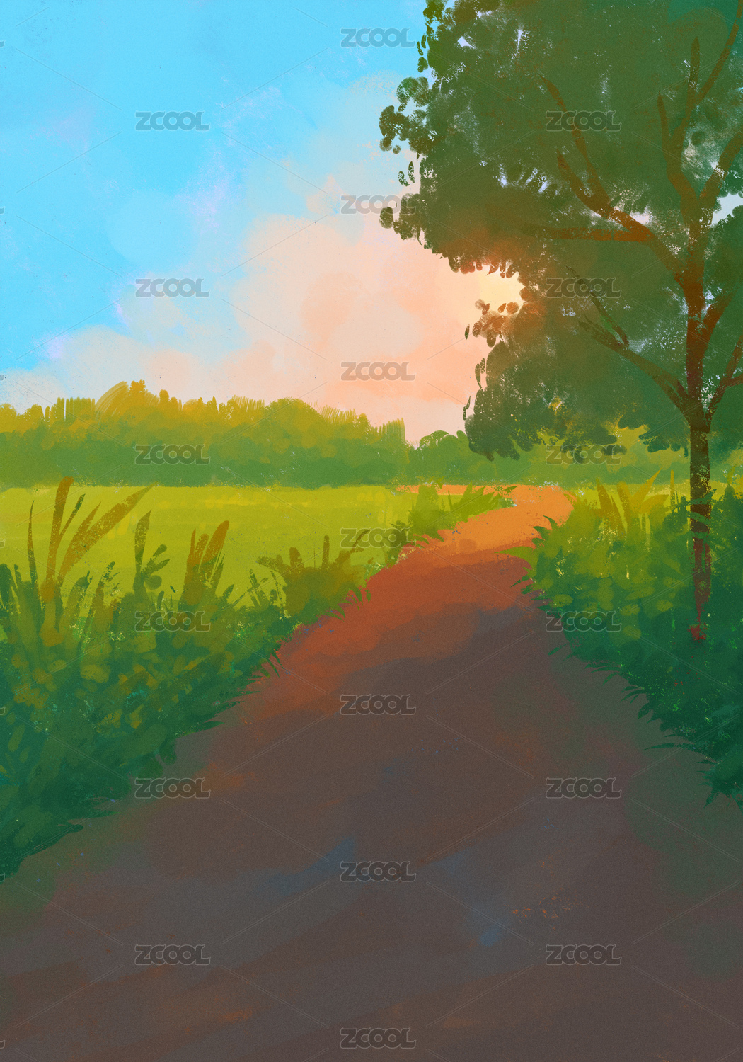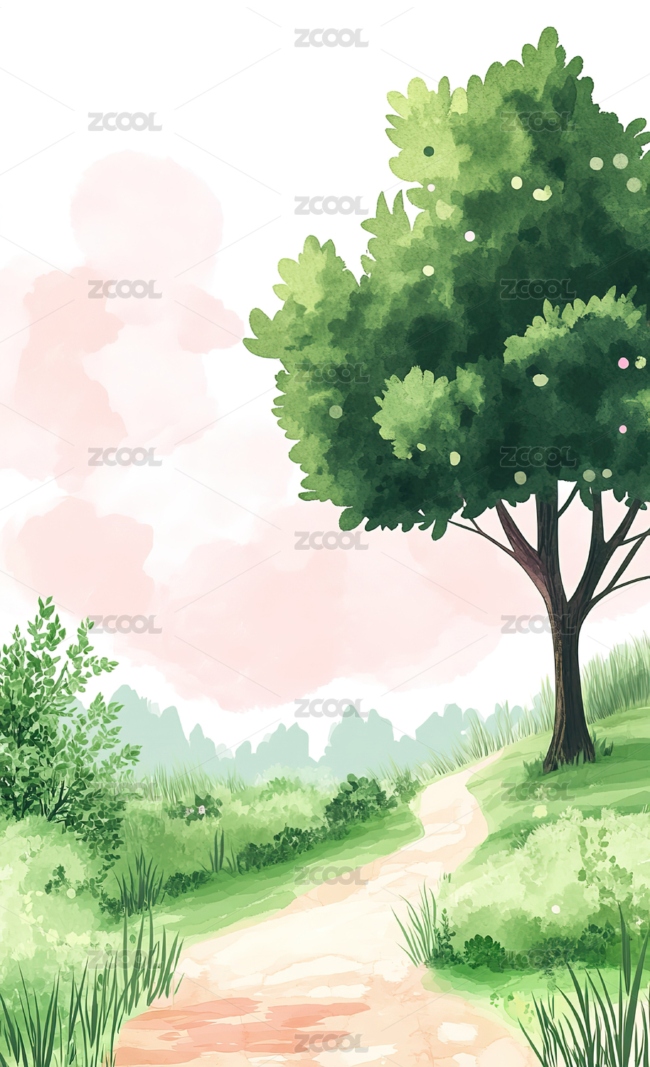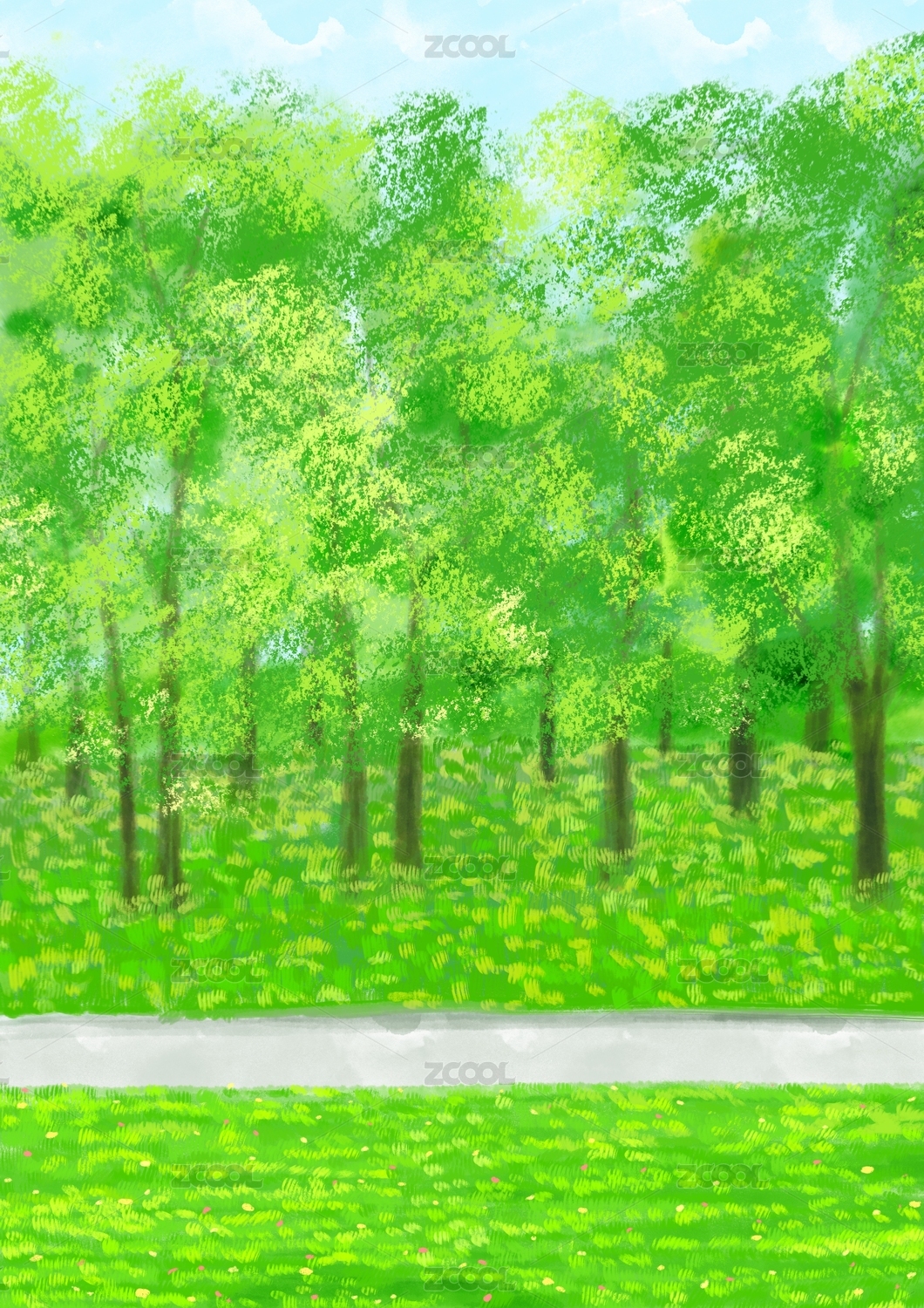 小清新户外树和草地风景插画