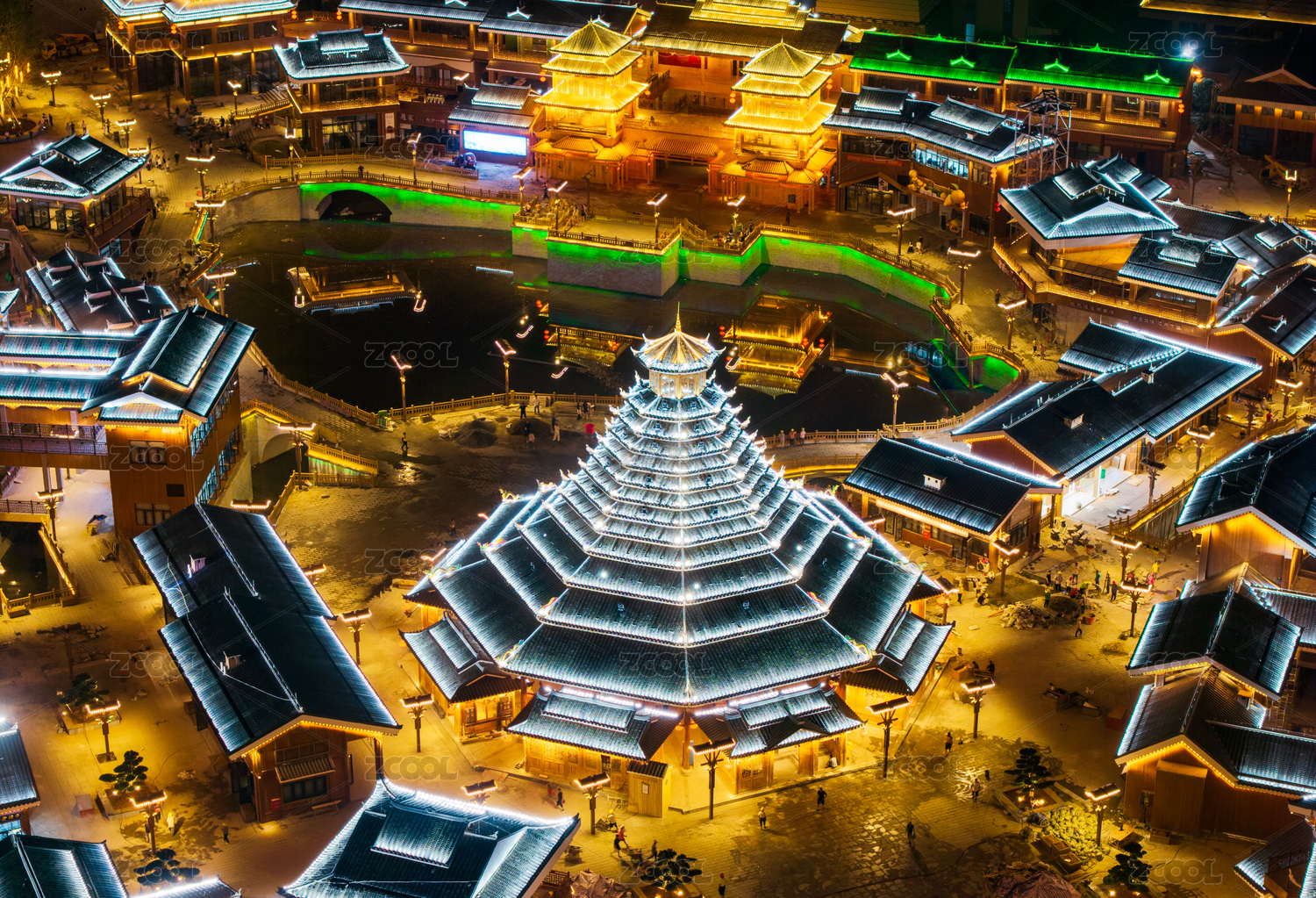 西双版纳景洪告庄西双景星光夜市夜景航拍