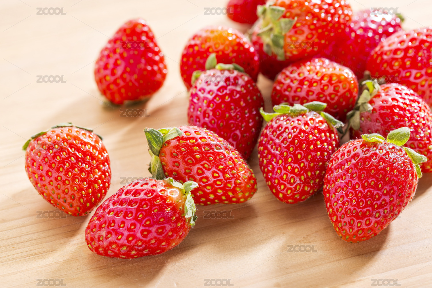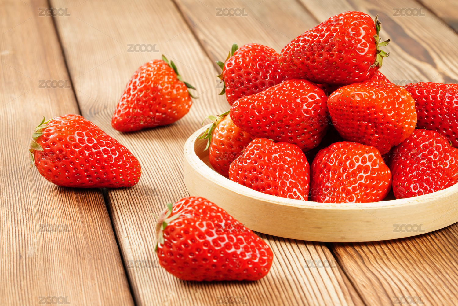 实木桌面上一堆新鲜的草莓
