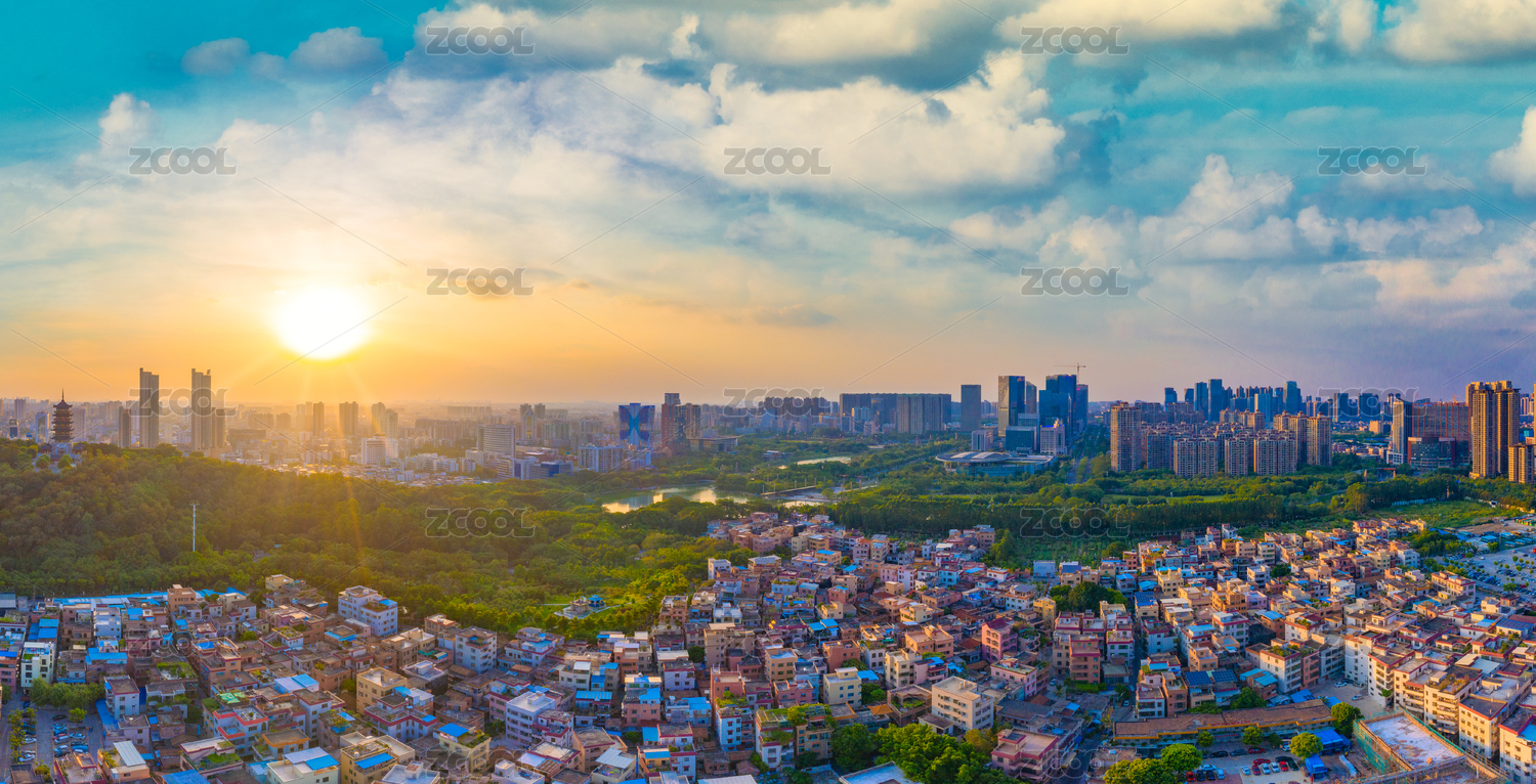 夕阳黄昏广州番禺城市建筑群航拍全景
