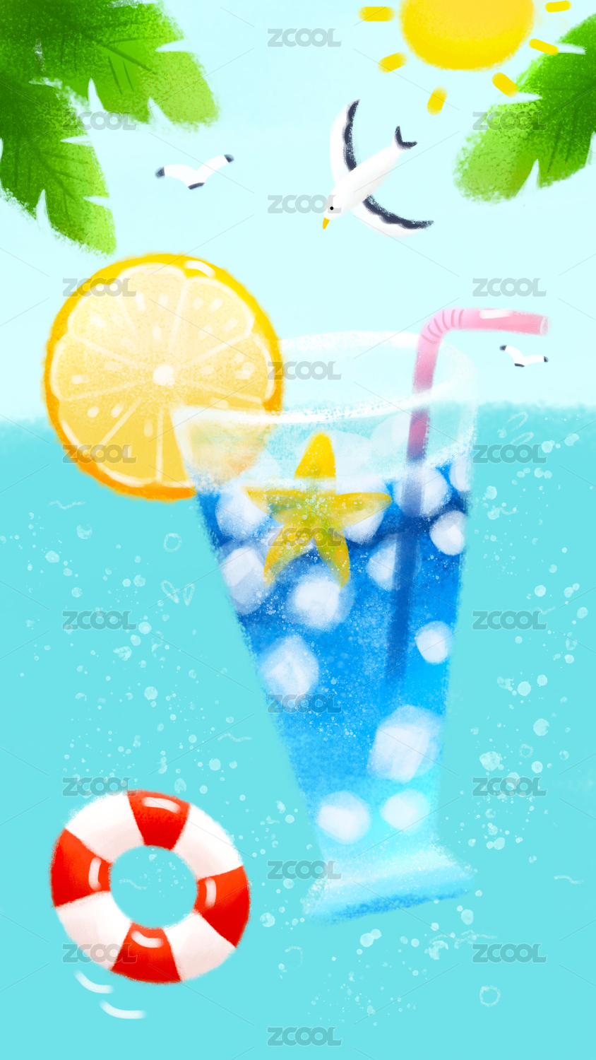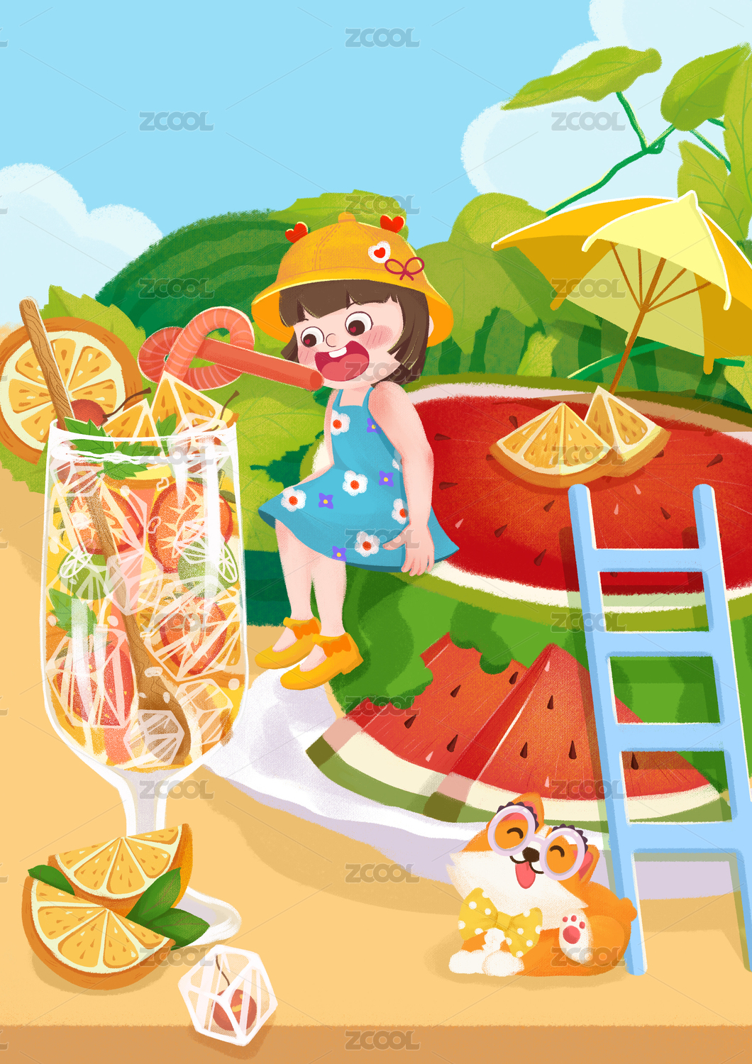 清凉夏日小暑大暑夏至海边度假吃瓜插画海报