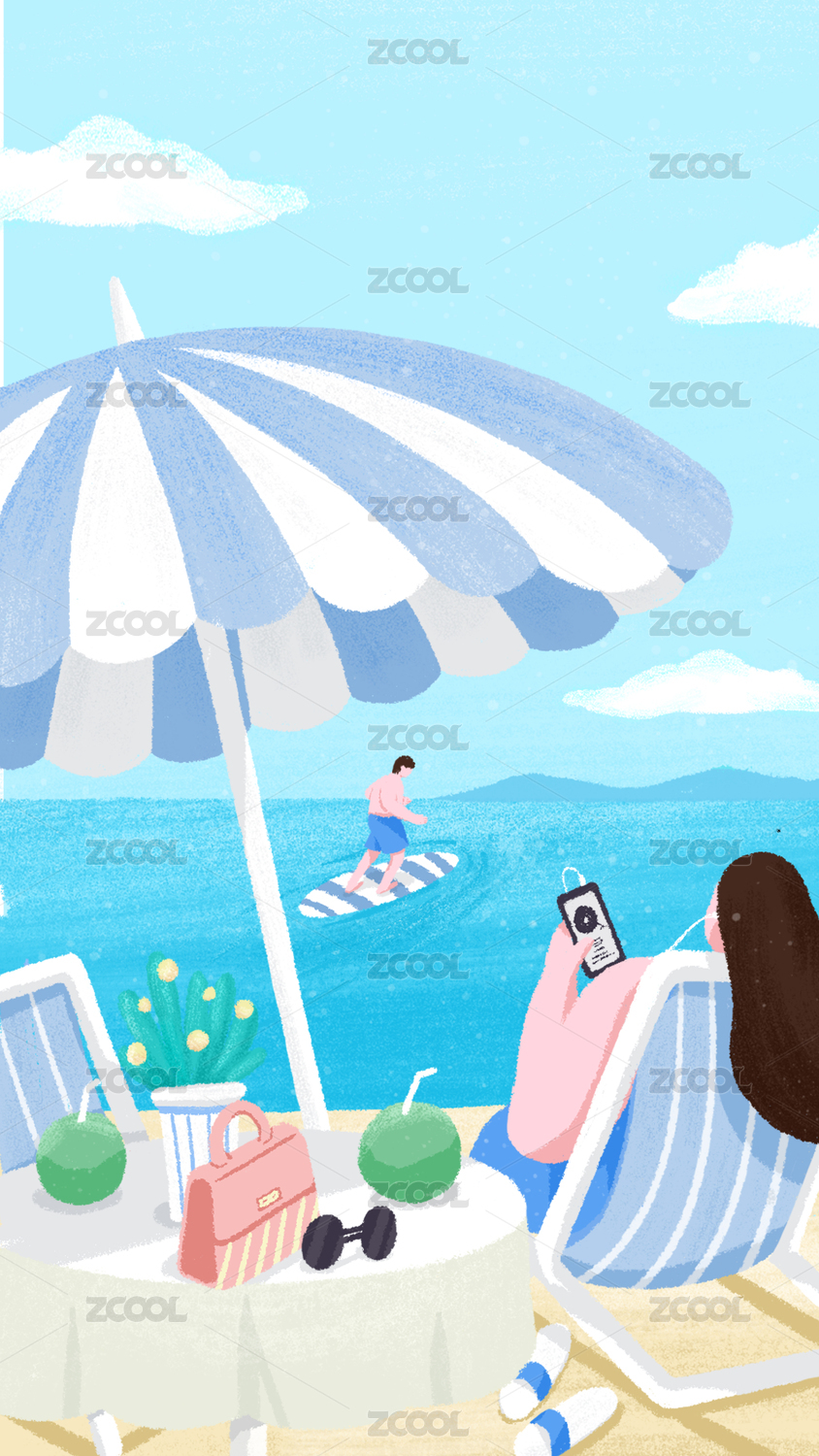 夏天美女海边解暑插画立夏节气炎热天气海报
