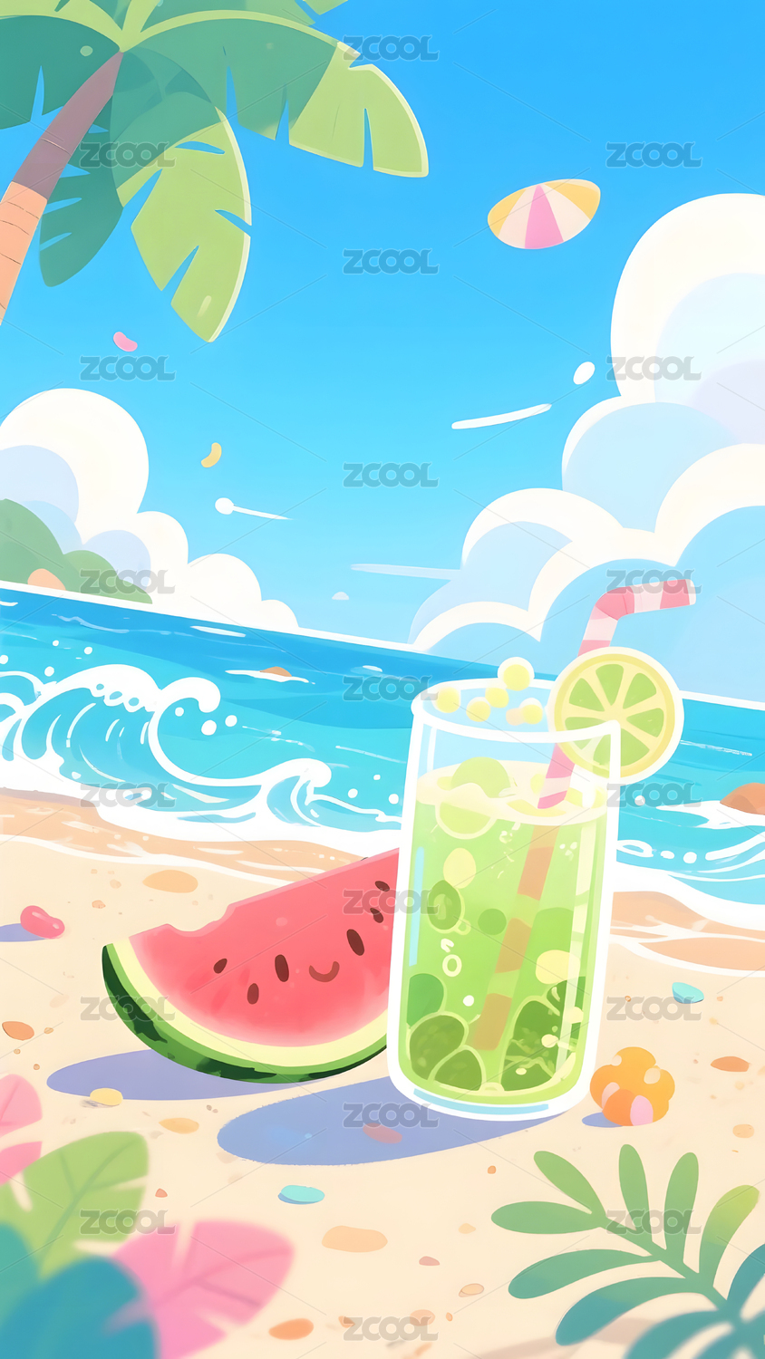 夏天,果汁,海边,沙滩,度假,柠檬,西瓜,太阳伞,天空,白云