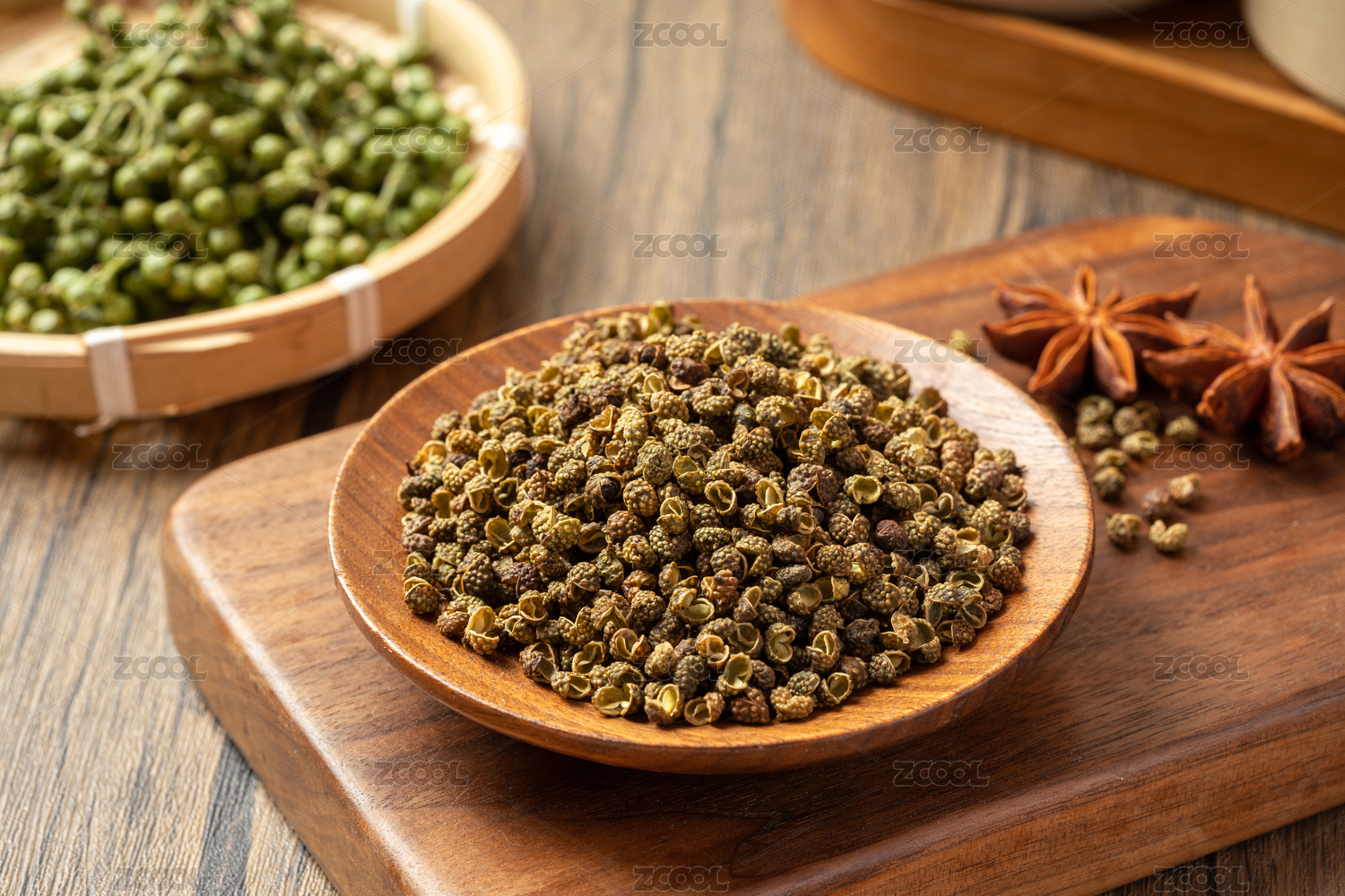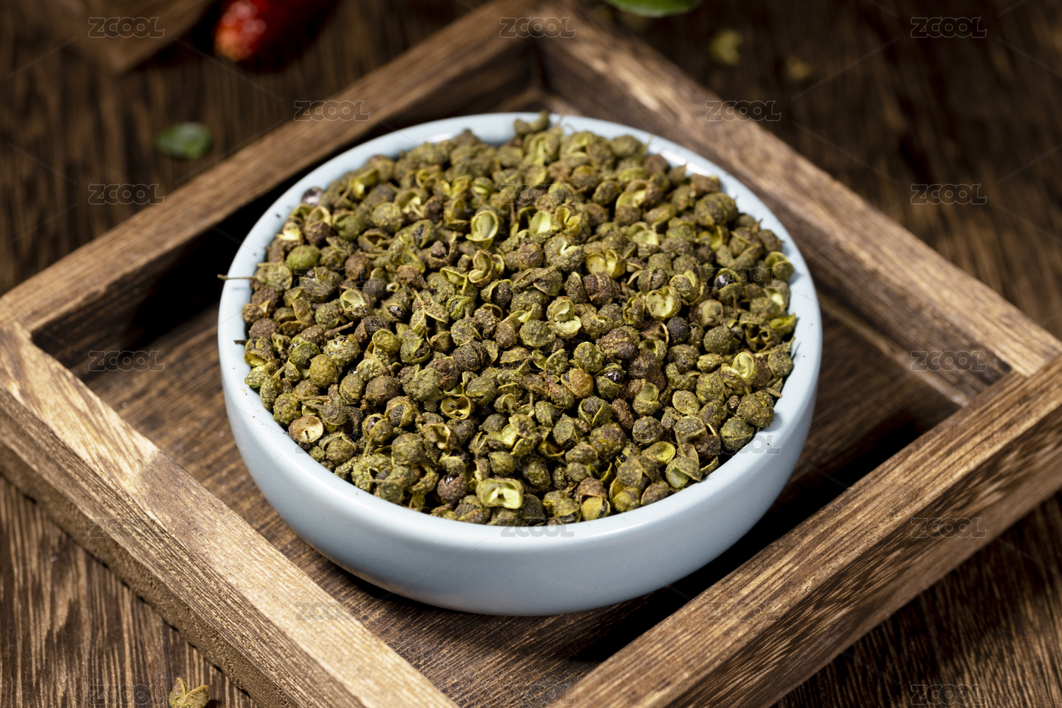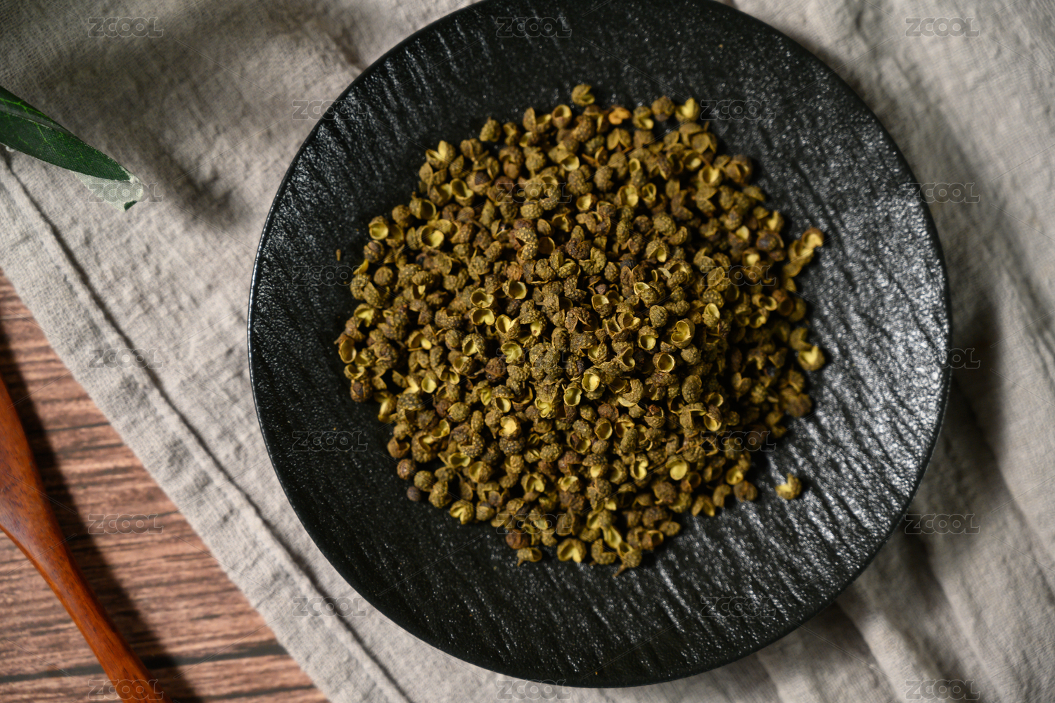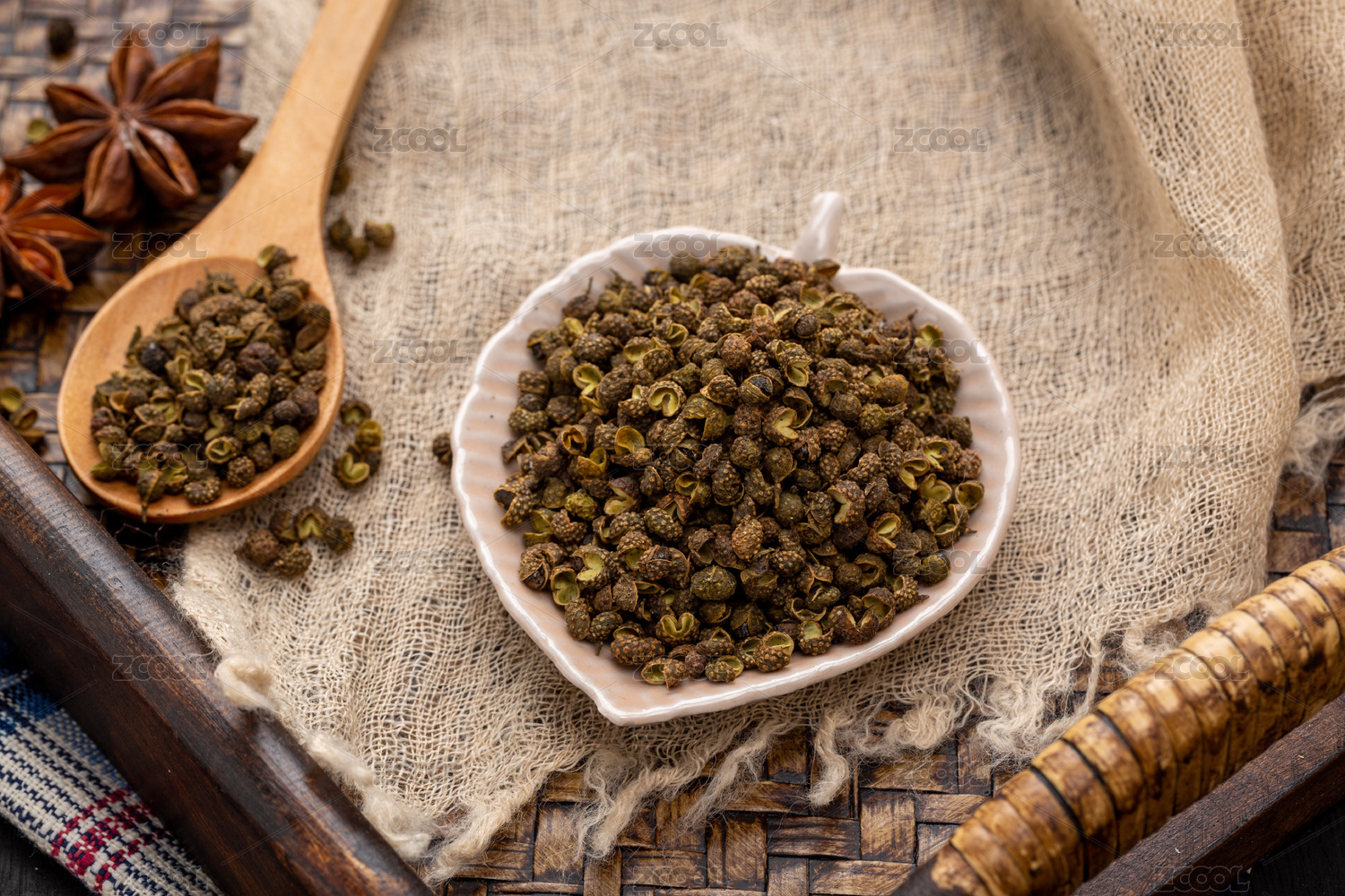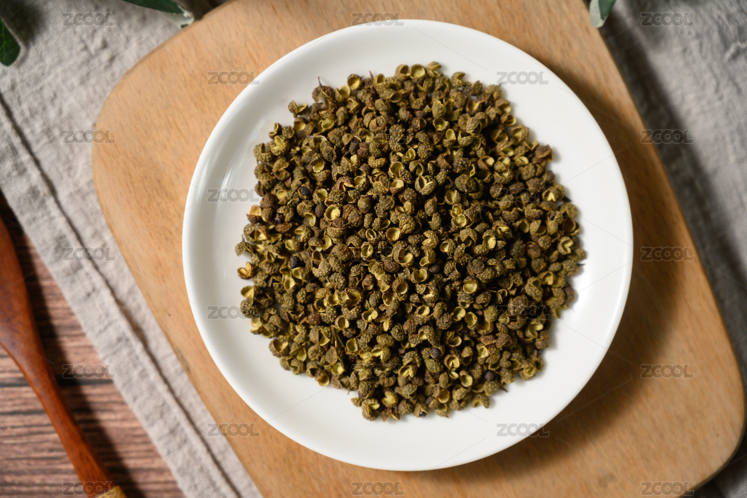 桌面上的盘子里的干爽的青花椒