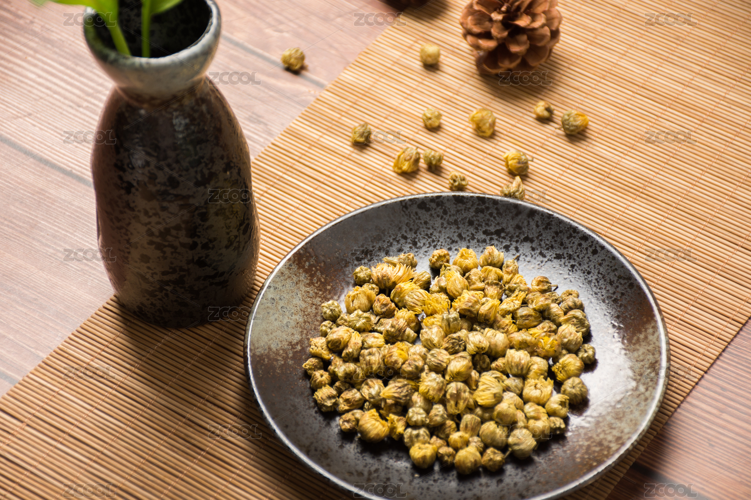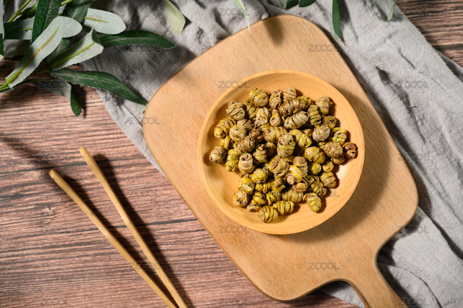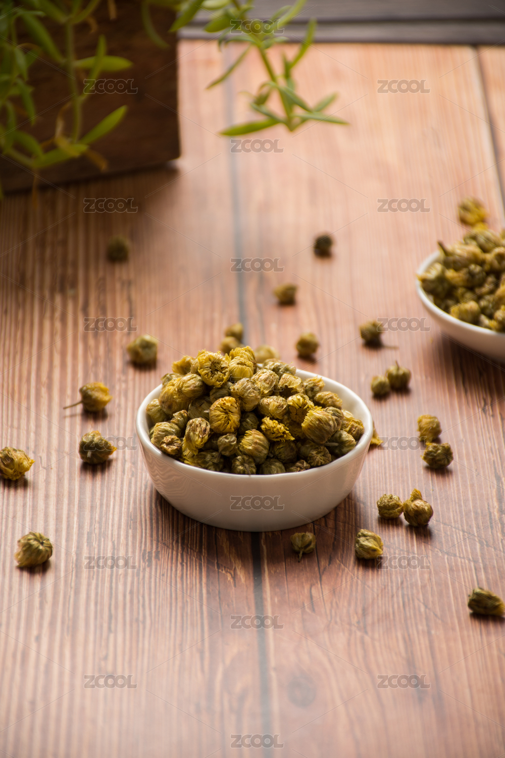 木板背景上满满一碗胎菊花