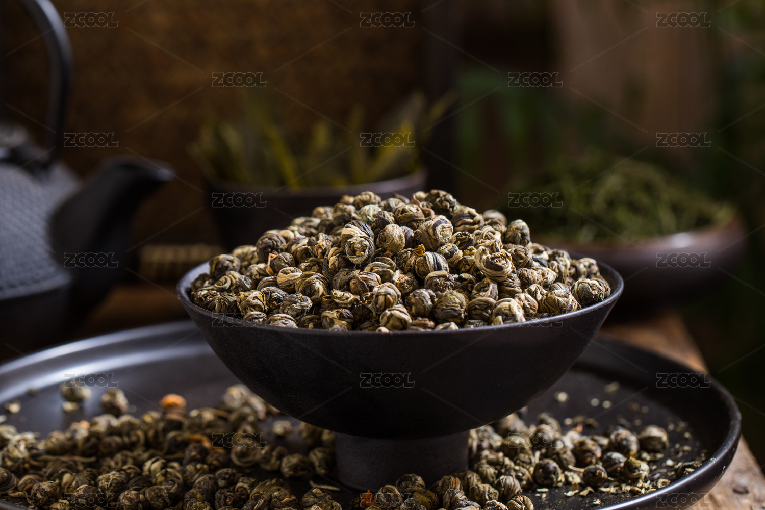 用黑色高脚碗装着的茉莉龙珠干茶叶