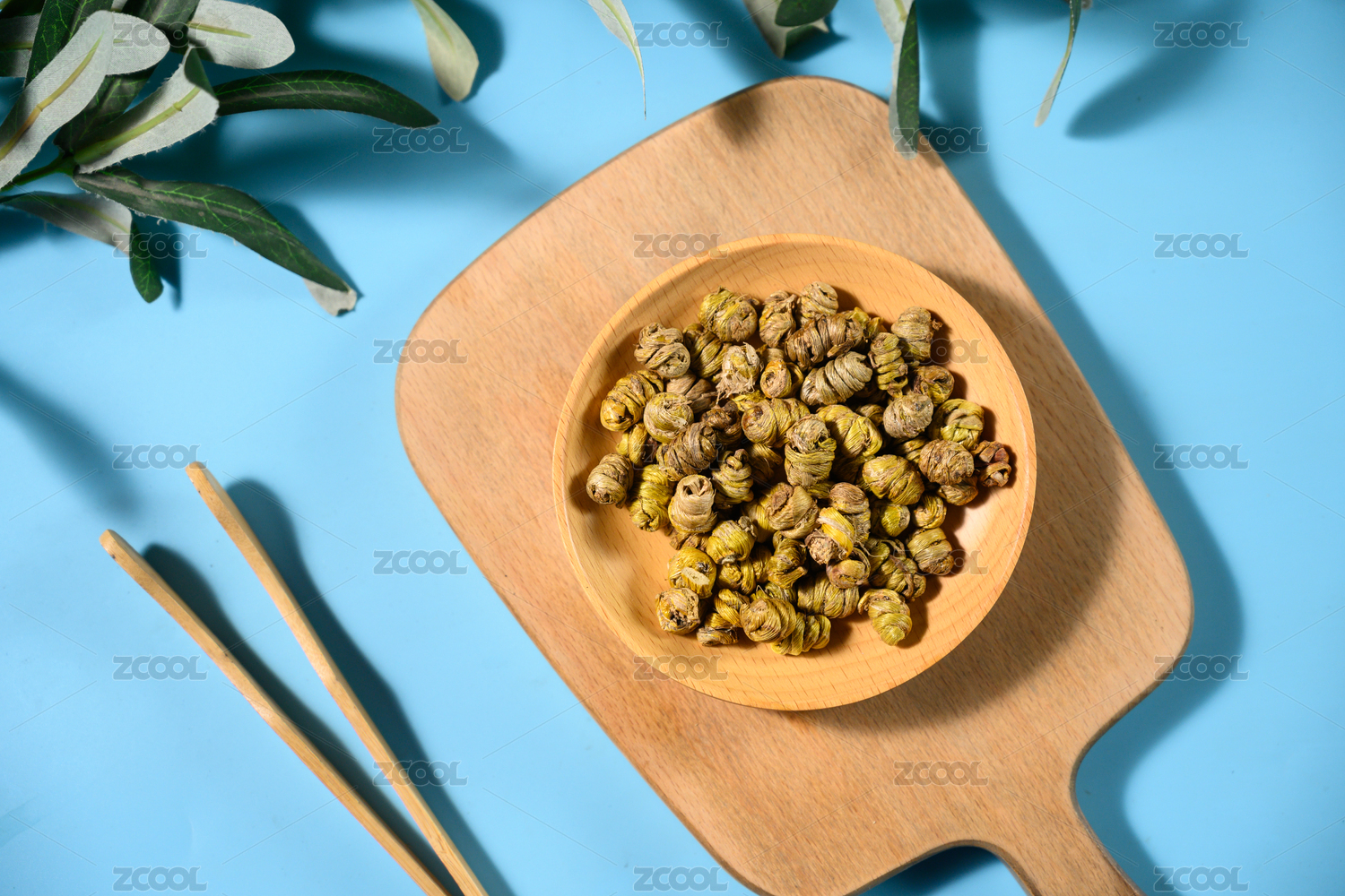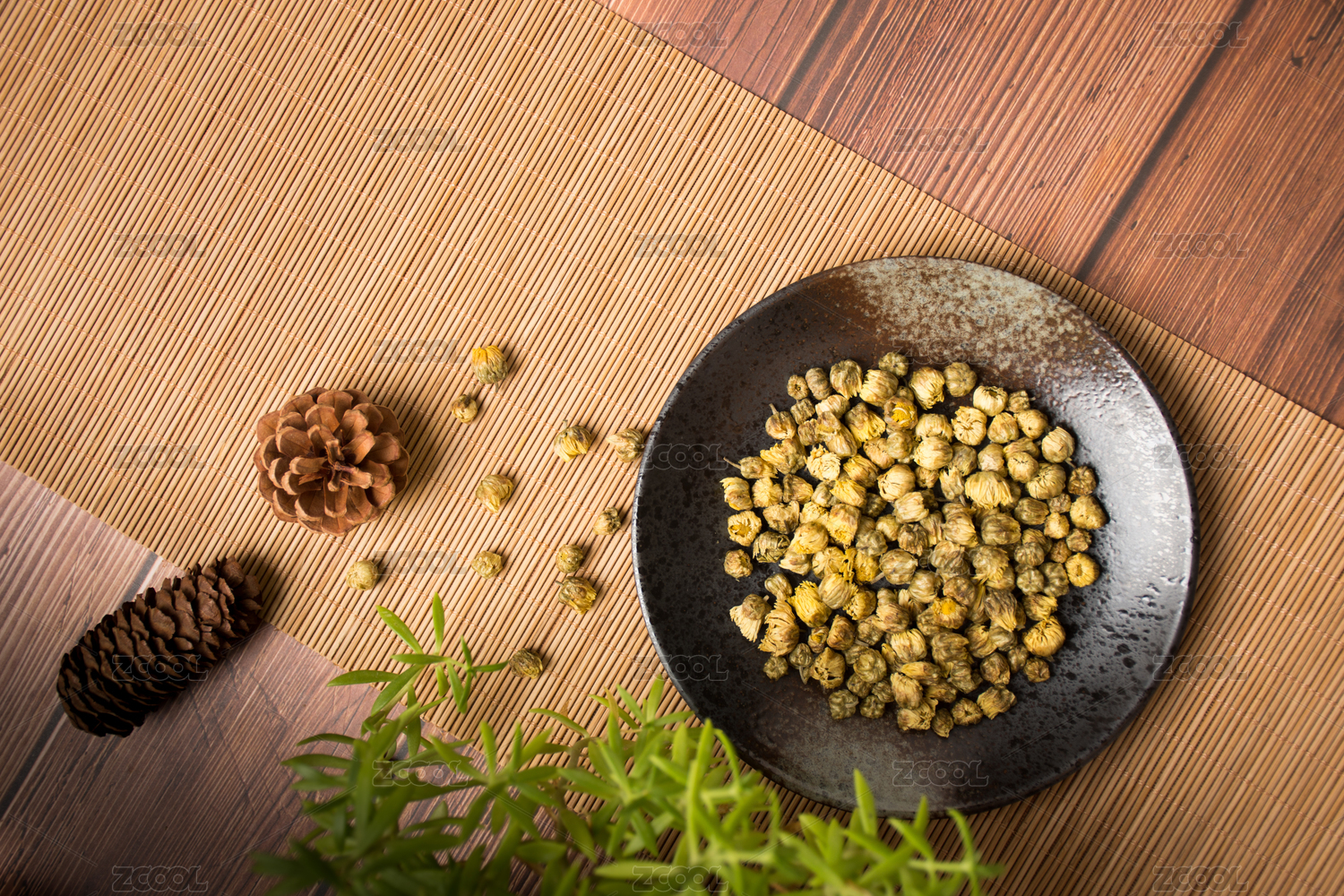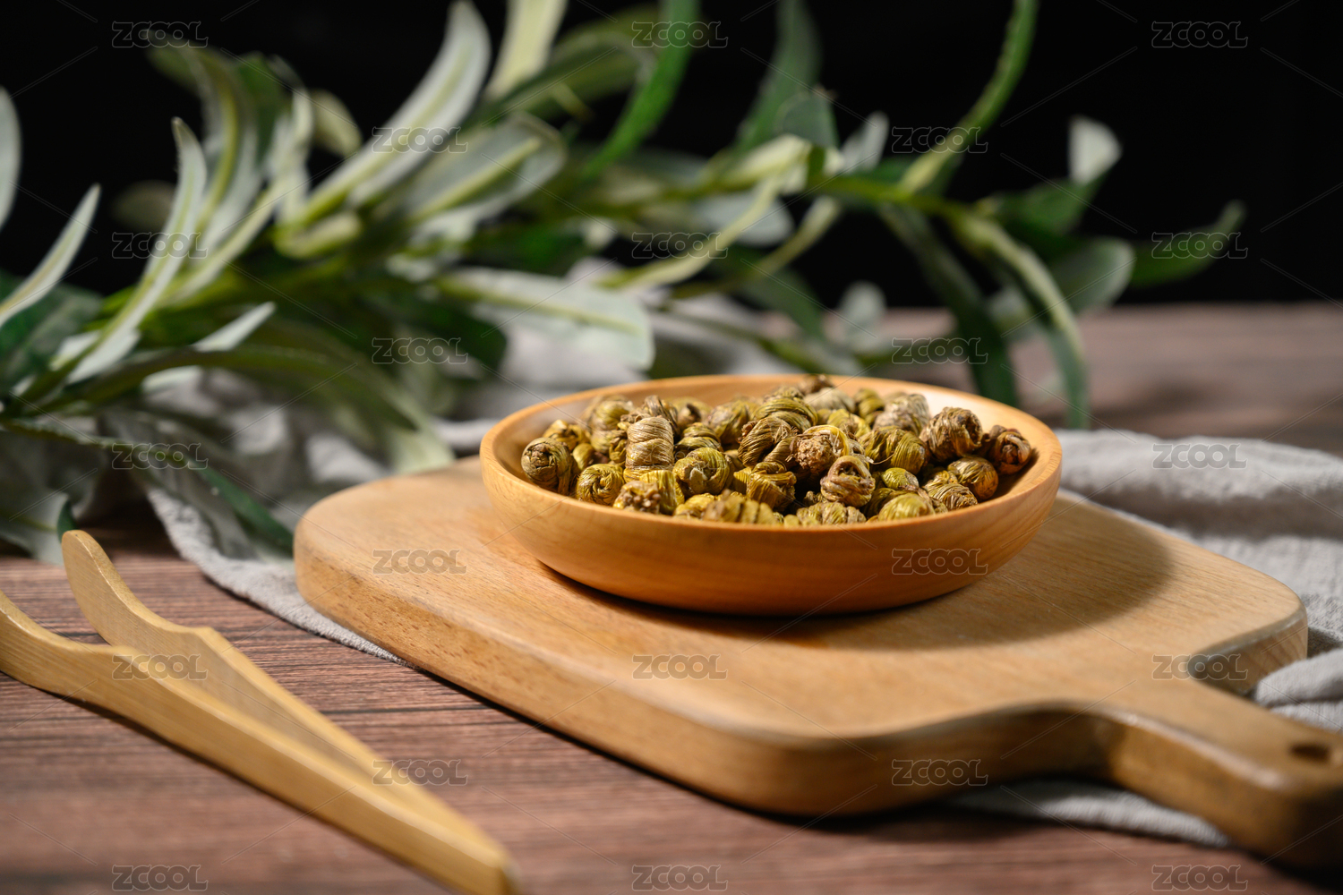 装在木碟里的茉莉龙珠干茶叶
