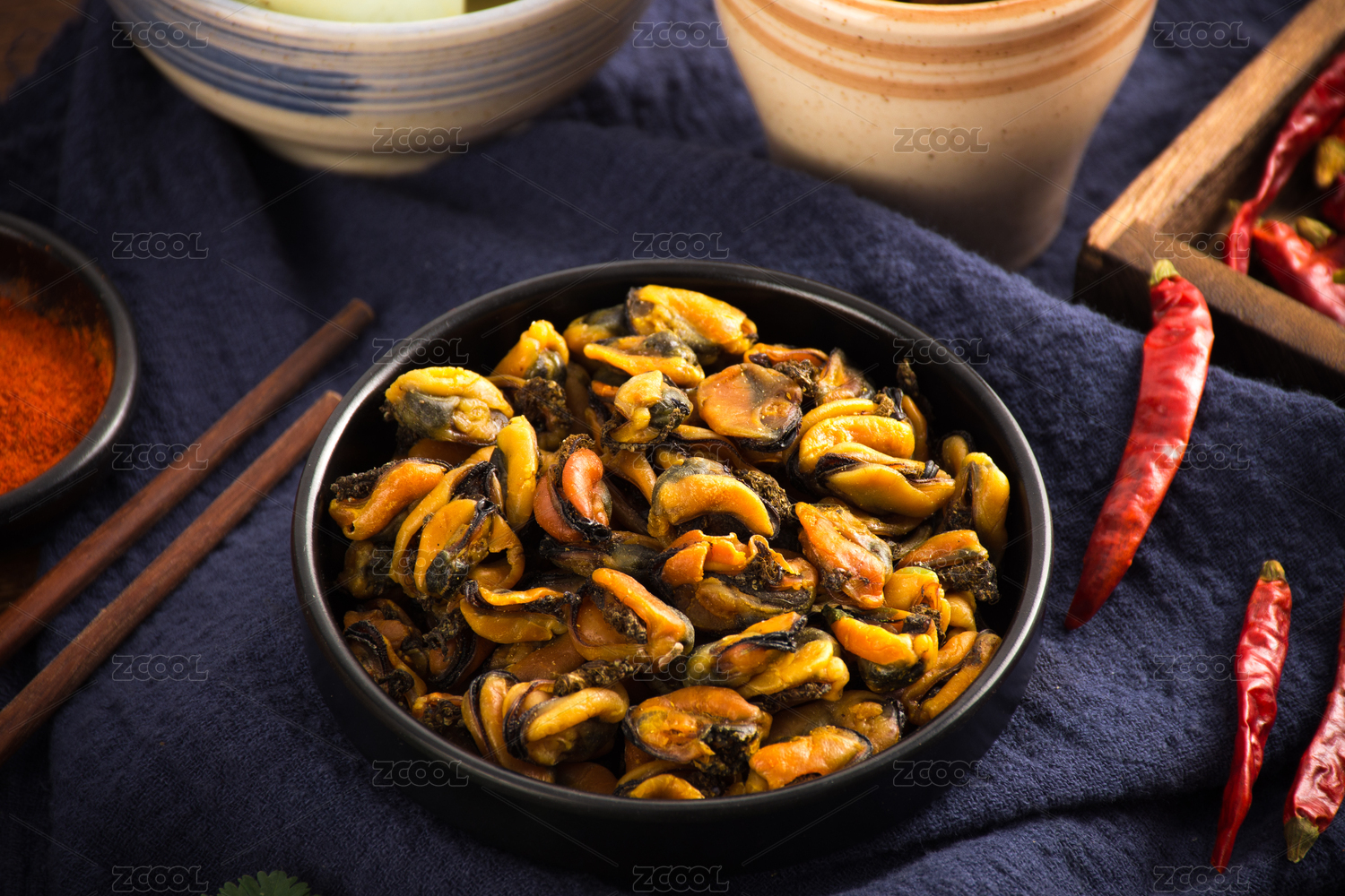 用黑色碗装着的海鲜干货淡菜干
