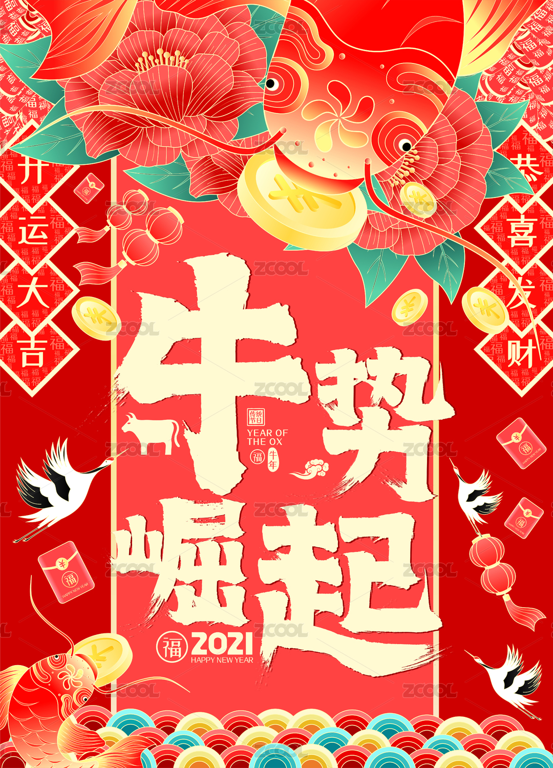 牛势崛起春节牡丹花开锦鲤送福矢量插画海报