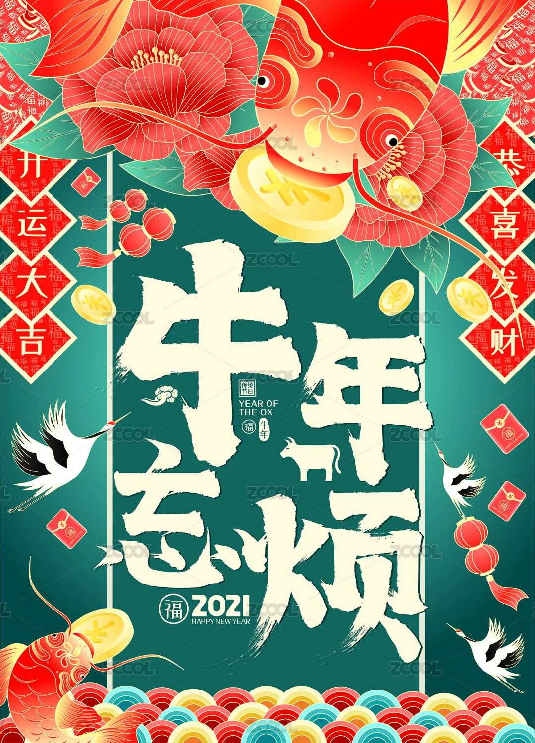 牛年忘烦锦鲤牡丹仙鹤送福开运春节海报