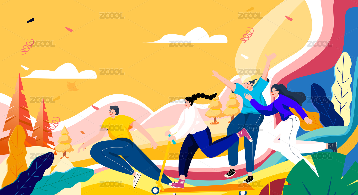 插画,人物,背景,青年节,阳光,年轻,男孩,女孩,夏天,植物