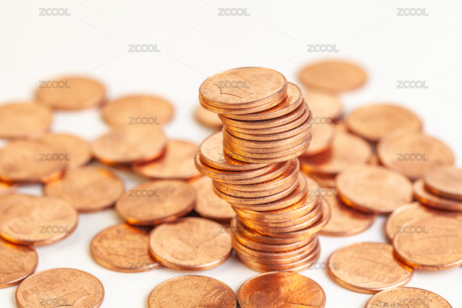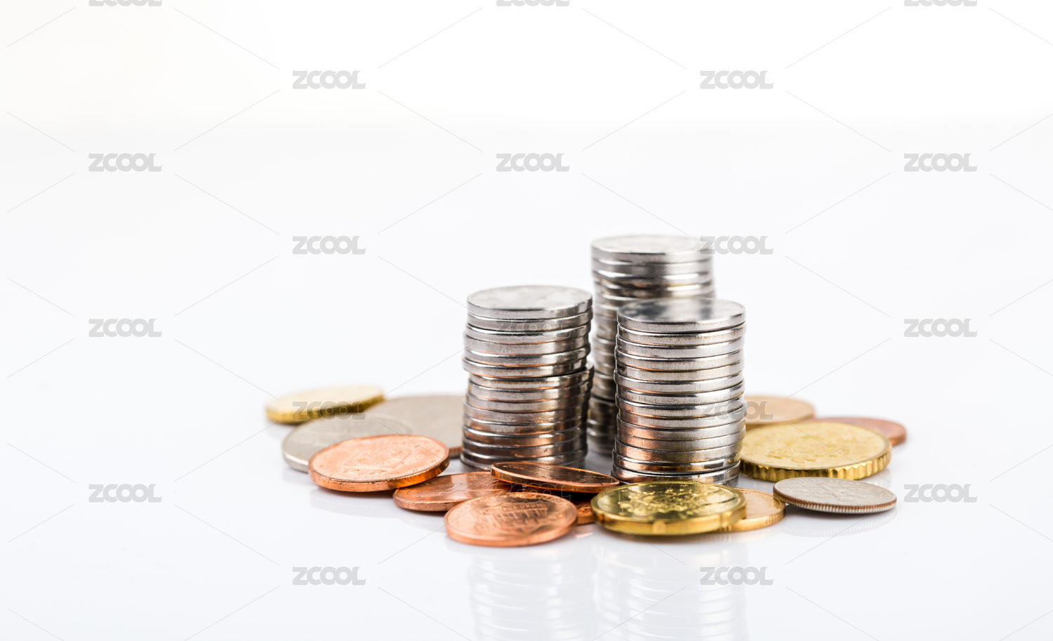 在白色背景上堆着的不同的高度的金币和银币。经济金融概念。