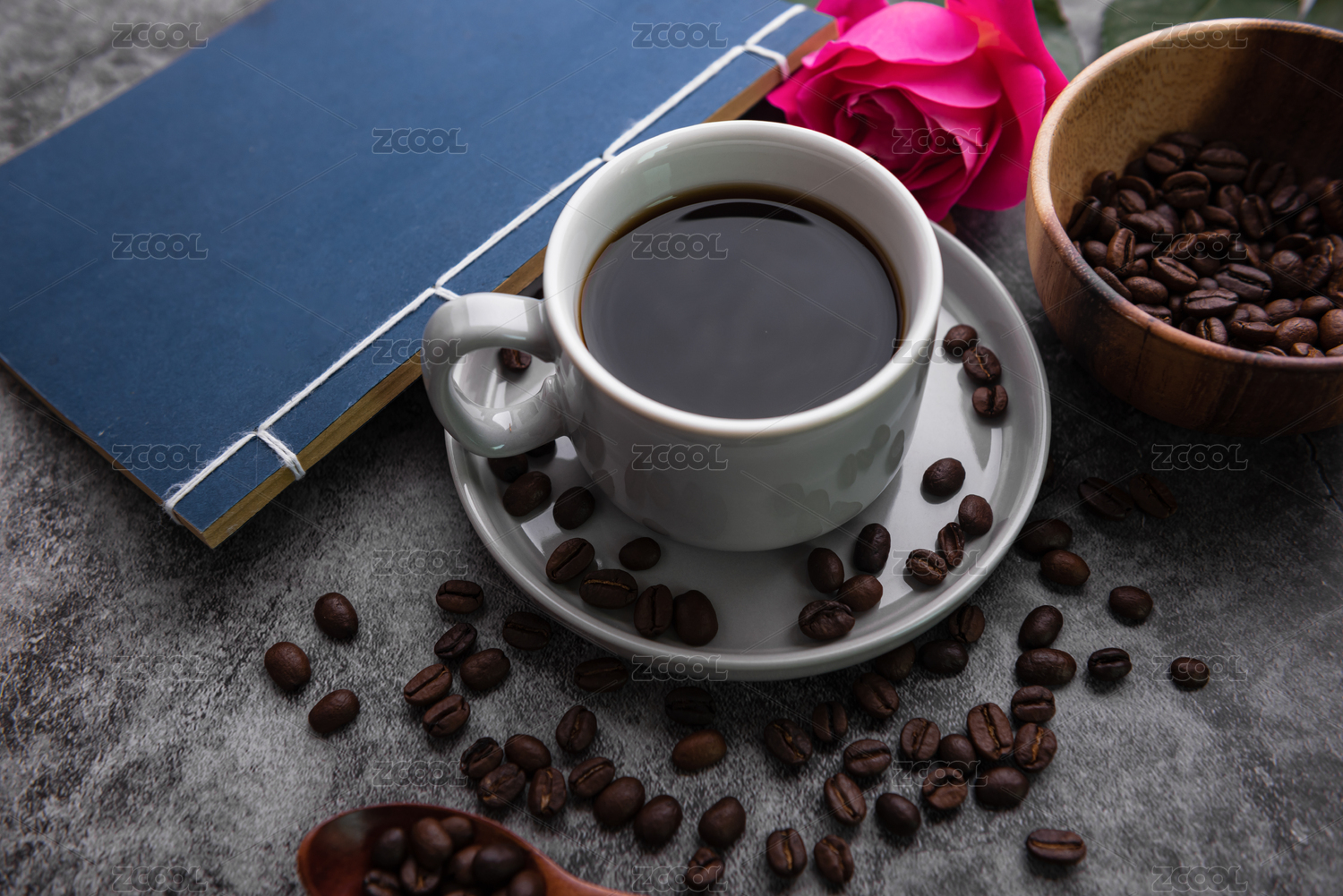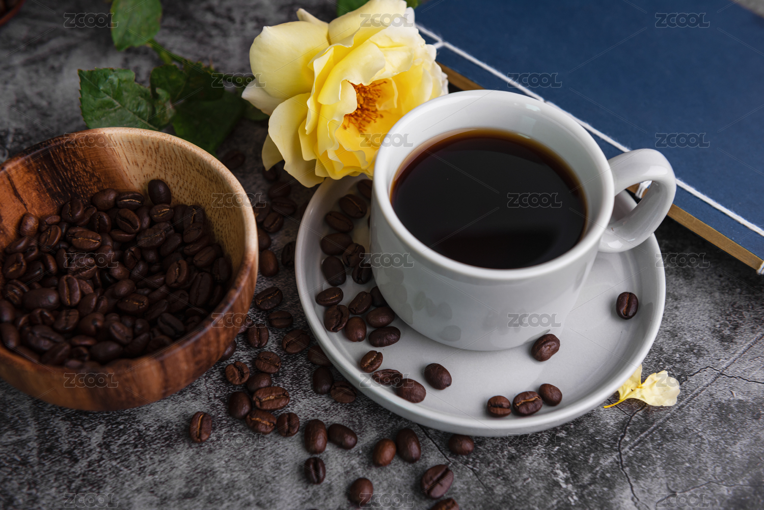 一杯咖啡和咖啡豆摆放在桌面上特写
