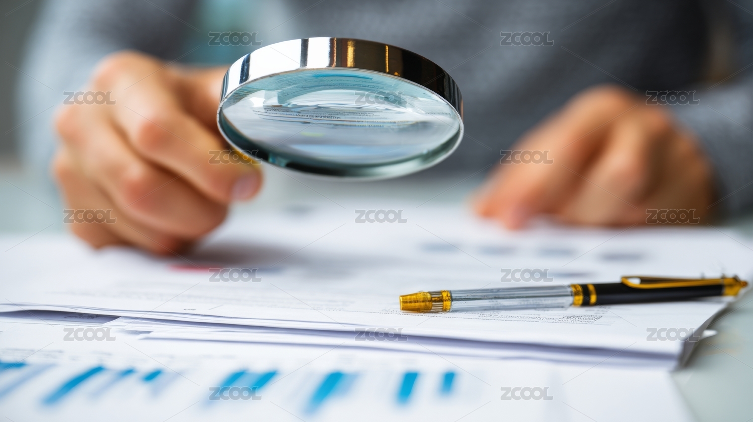 金融人士第一人称视角拿着钢笔放大镜评估评测预测金融经济趋势走势报表图表风险分析解析数据概念