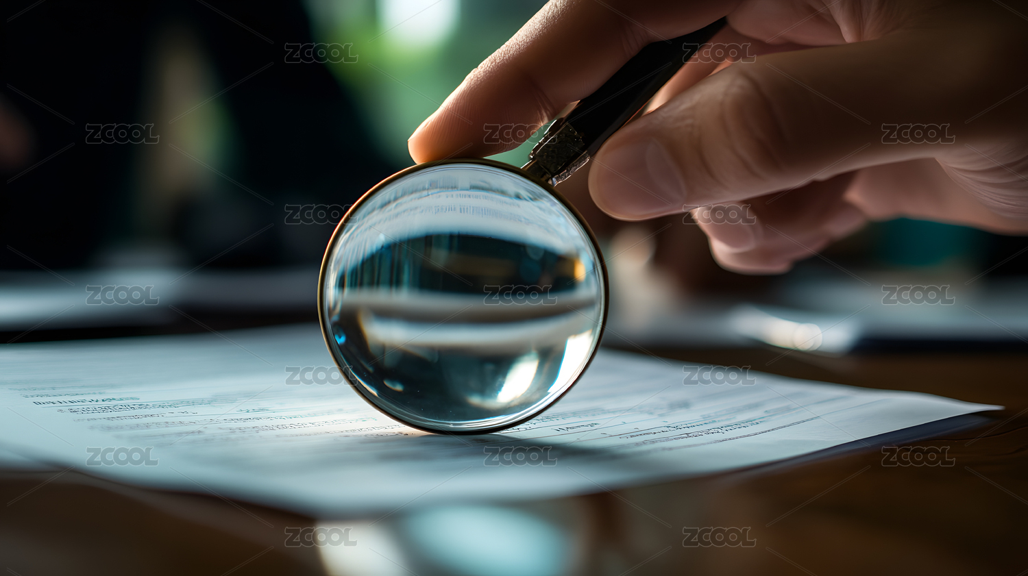 一个金融人士拿着放大镜观察金融图表报表报告数据