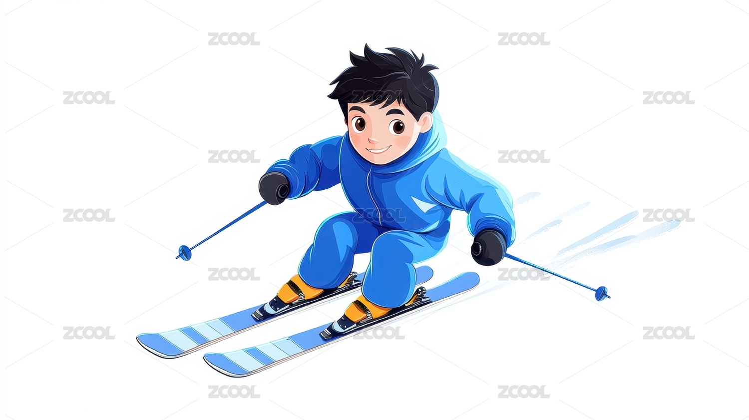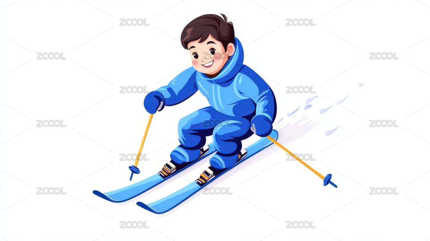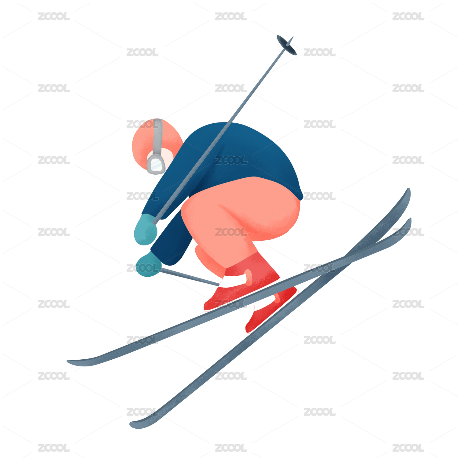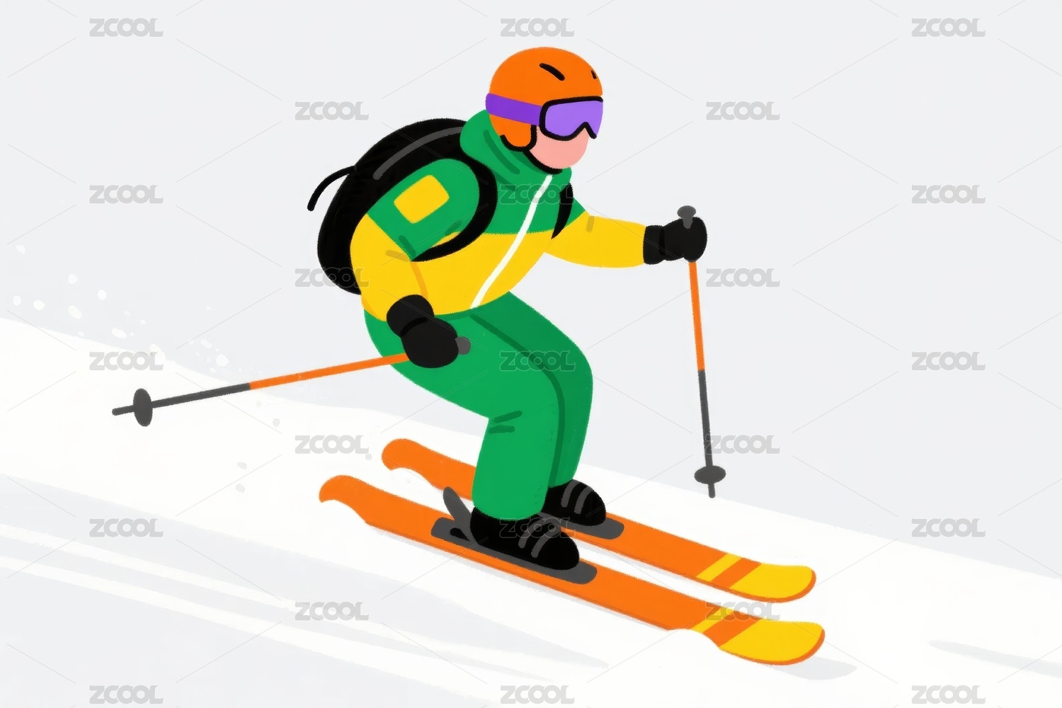 一名男性双板滑雪者 穿着鲜艳的滑雪服在雪地快速滑行 色块风格手绘插画