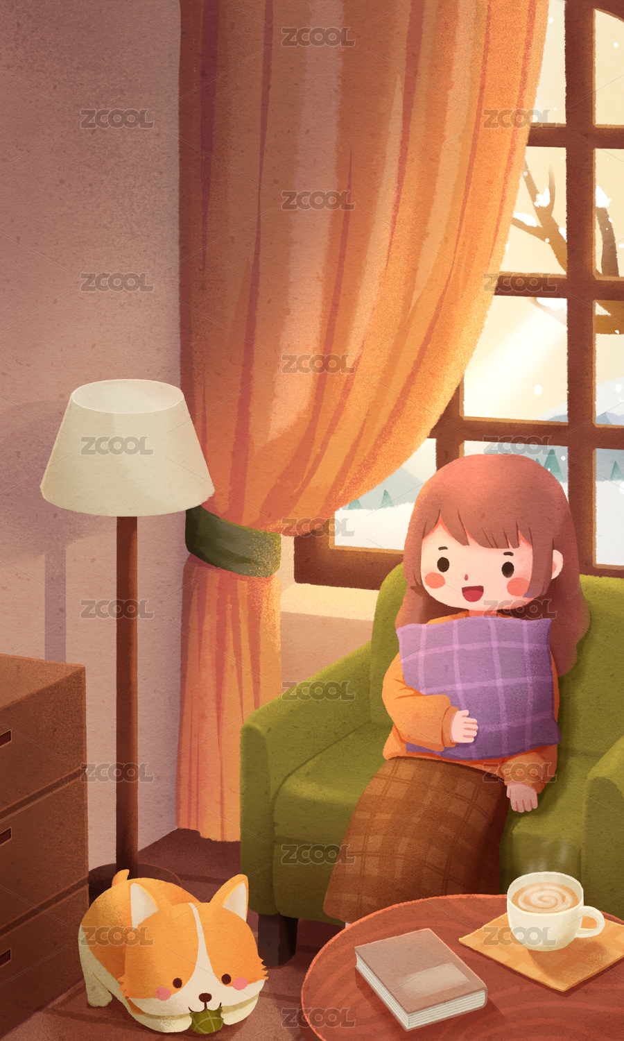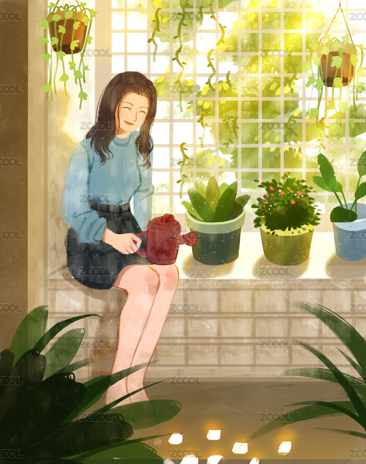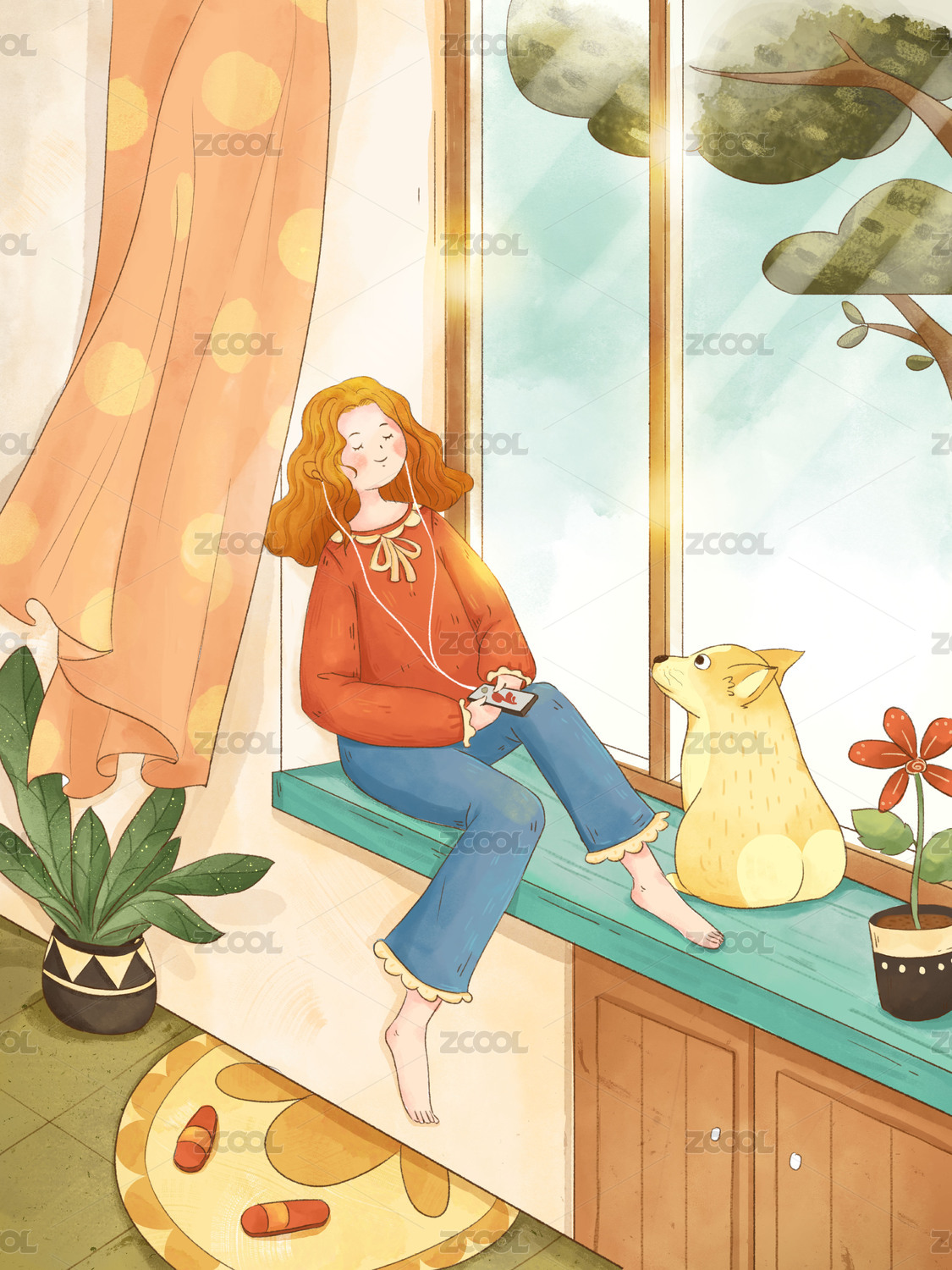 室内,插画,女孩,吉它,高兴,居家,阳光,竖幅,光影,宅家