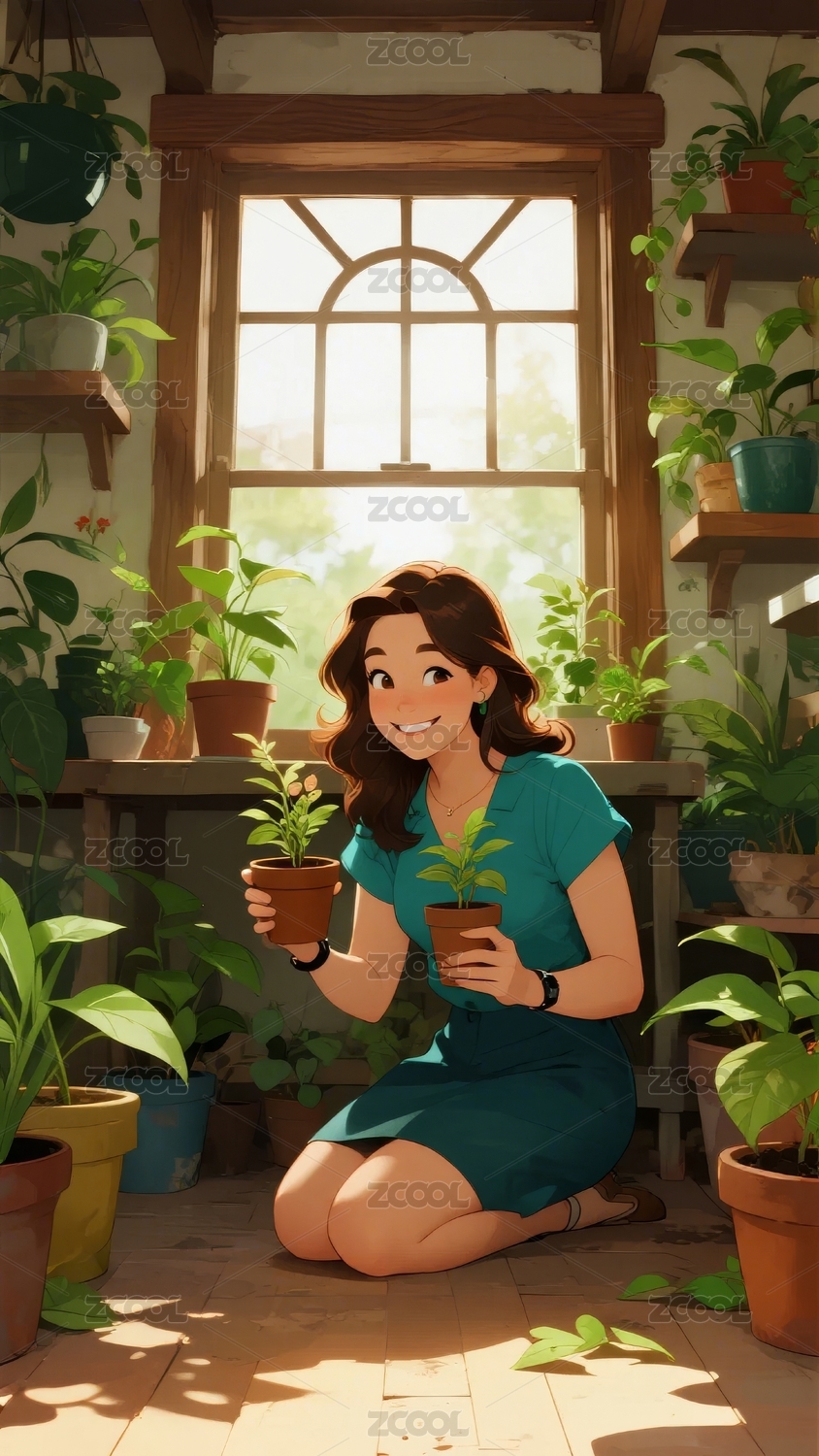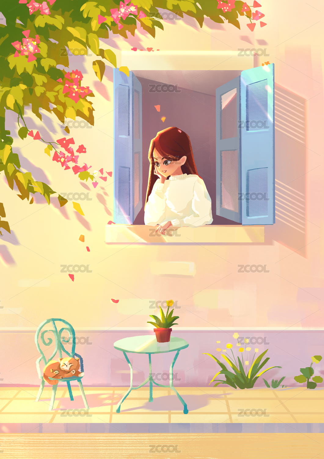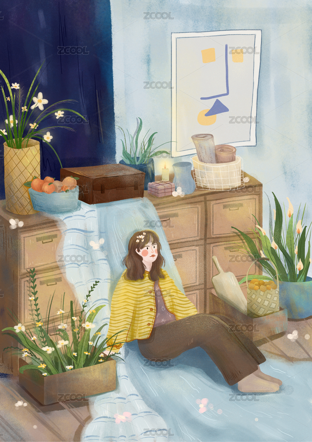 室内,插画,女孩,吉它,高兴,居家,阳光,竖幅,光影,宅家