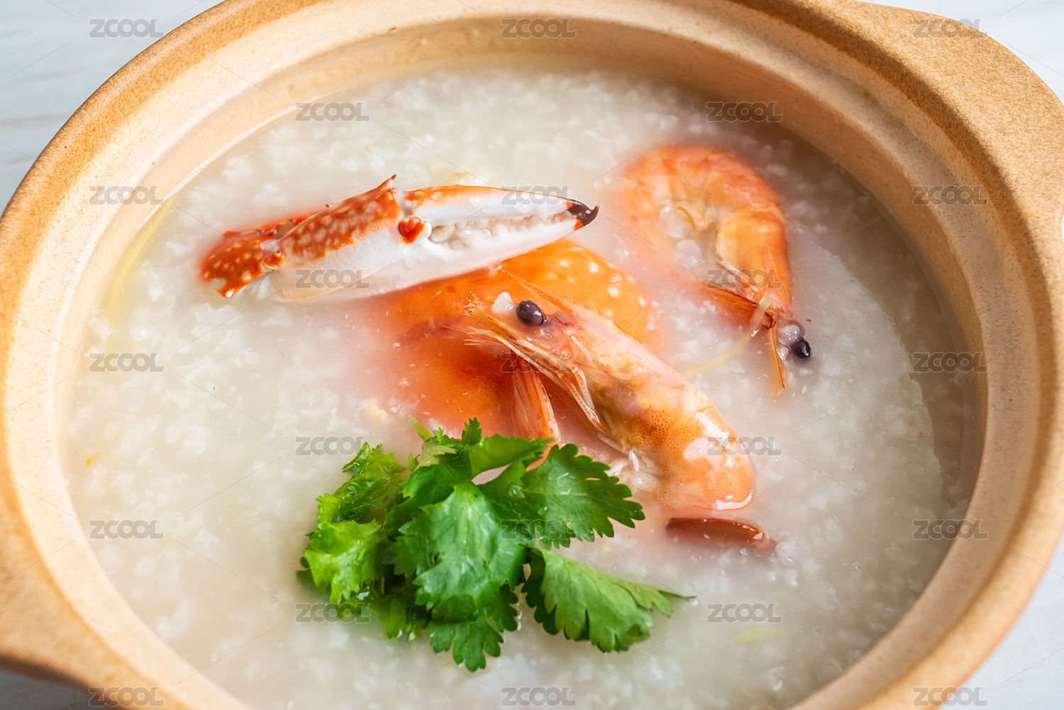 中国潮汕砂锅粥,虾蟹海鲜粥特写